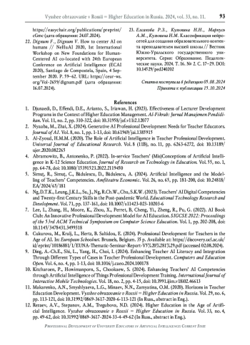 8. Cukurova M., Kralj L., Hertz B., Saltidou E. Professional Development for Teachers in the Age of AI // In: European Schoolnet. Brussels, Belgium. 2024. 35 p. URL: https://discovery.ucl.ac.uk/id/eprint/10186881/1/EUNA-Thematic-Seminar-Report-V5%20%281%29.pdf (дата обращения: 02.08.2024).