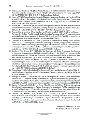 17. Любимова Е.М., Мышенков И.И. Формирование содержания подготовки будущих учителей к применению технологий искусственного интеллекта в профессиональной деятельности // Высшее педагогическое образование в провинции: традиции и новации. Саратов: Изд-во “Саратовский источник”, 2023. С. 359-365. EDN: SJMTAP