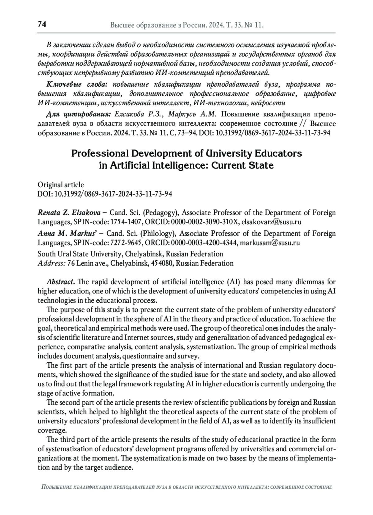 23. Елсакова Р.З., Кузьмина Н.Н., Маркусь А.М., Кузьмина Н.М. Классификация нейросетей для создания образовательного контента преподавателем высшей школы // Вестник Южно-Уральского государственного университета. Серия: Образование. Педагогические науки. 2024. Т. 16. № 2. С. 17-29. DOI: 10.14529/ped240202 EDN: BGYEFB