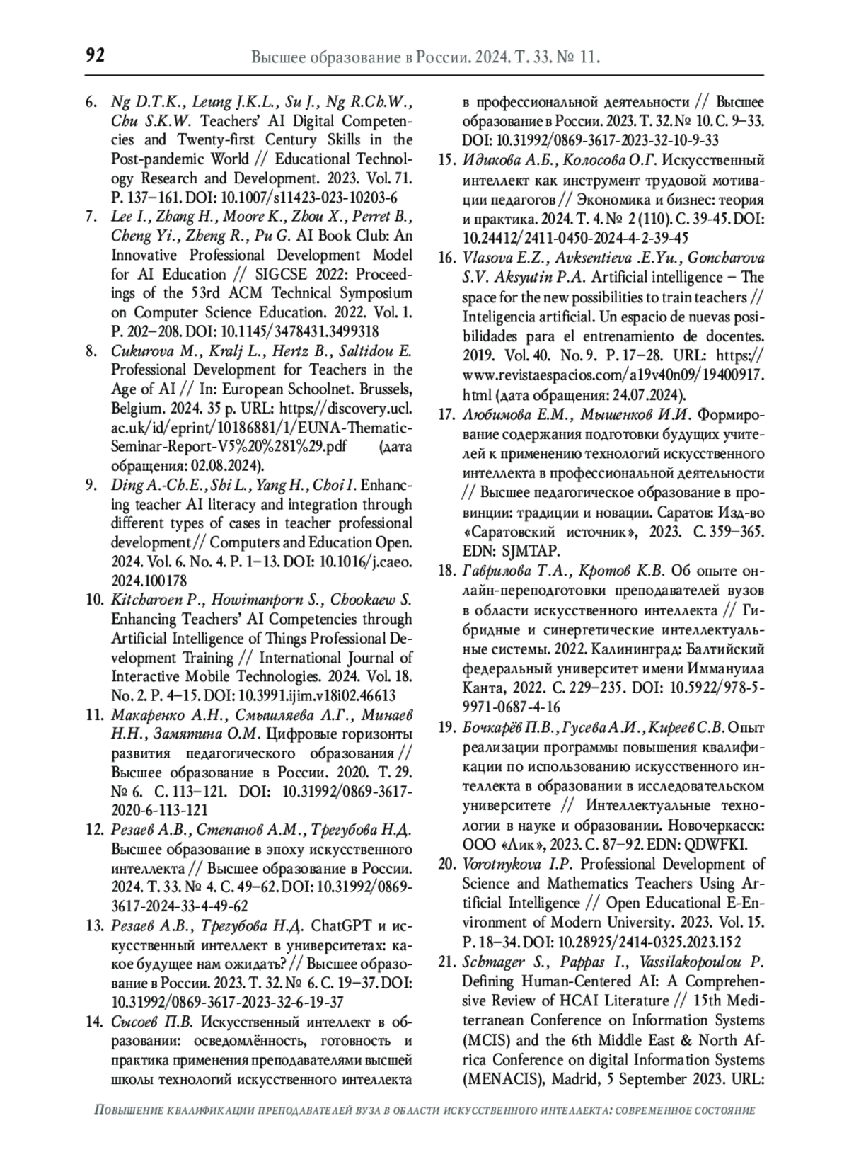 14. Сысоев П.В. Искусственный интеллект в образовании: осведомлённость, готовность и практика применения преподавателями высшей школы технологий искусственного интеллекта в профессиональной деятельности // Высшее образование в России. 2023. Т. 32. № 10. С. 9-33. DOI: 10.31992/0869-3617-2023-32-10-9-33 EDN: TZYTKM