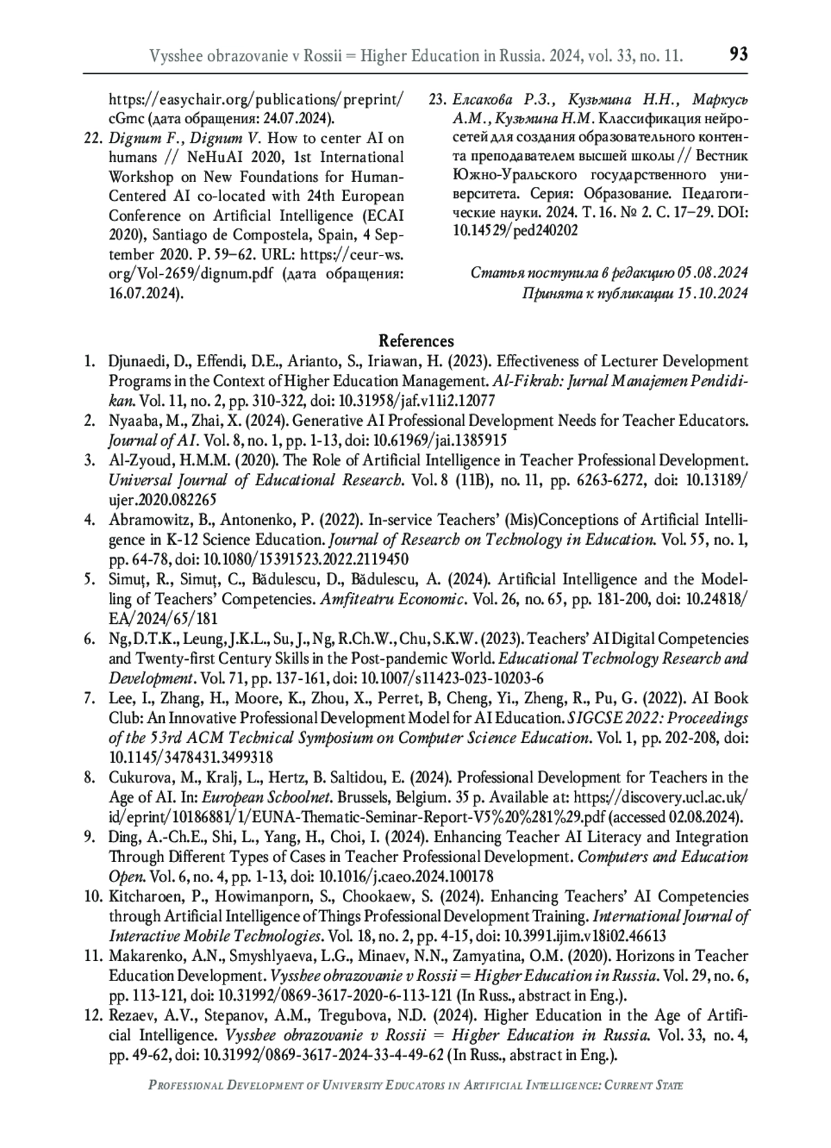 3. Al-Zyoud H.M.M. The Role of Artificial Intelligence in Teacher Professional Development // Universal Journal of Educational Research. 2020. Vol. 8 (11B). No. 11. P. 6263-6272. DOI: 10.13189/ujer.2020.082265 EDN: NMRCXY