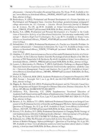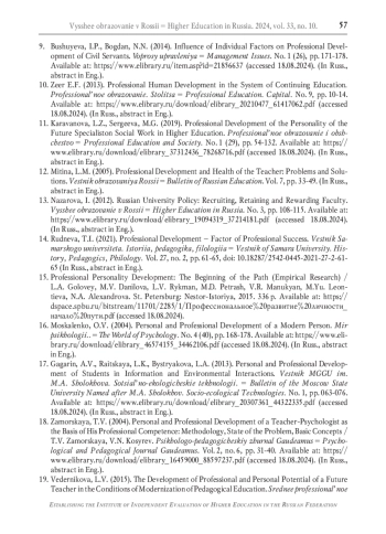 1. Зборовский Г.Е., Амбарова П.А. Научно-педагогические работники как социальная общность в меняющихся условиях академического развитии // Образование и наука. 2022. Т. 24. № 5. С. 147-180. DOI: 10.17853/1994-5639-2022-5-147-180 EDN: DQKMBA