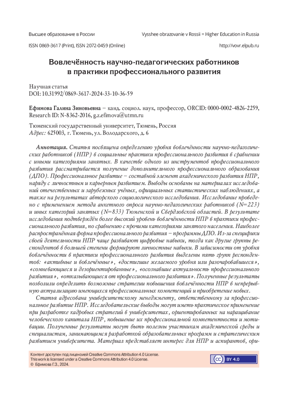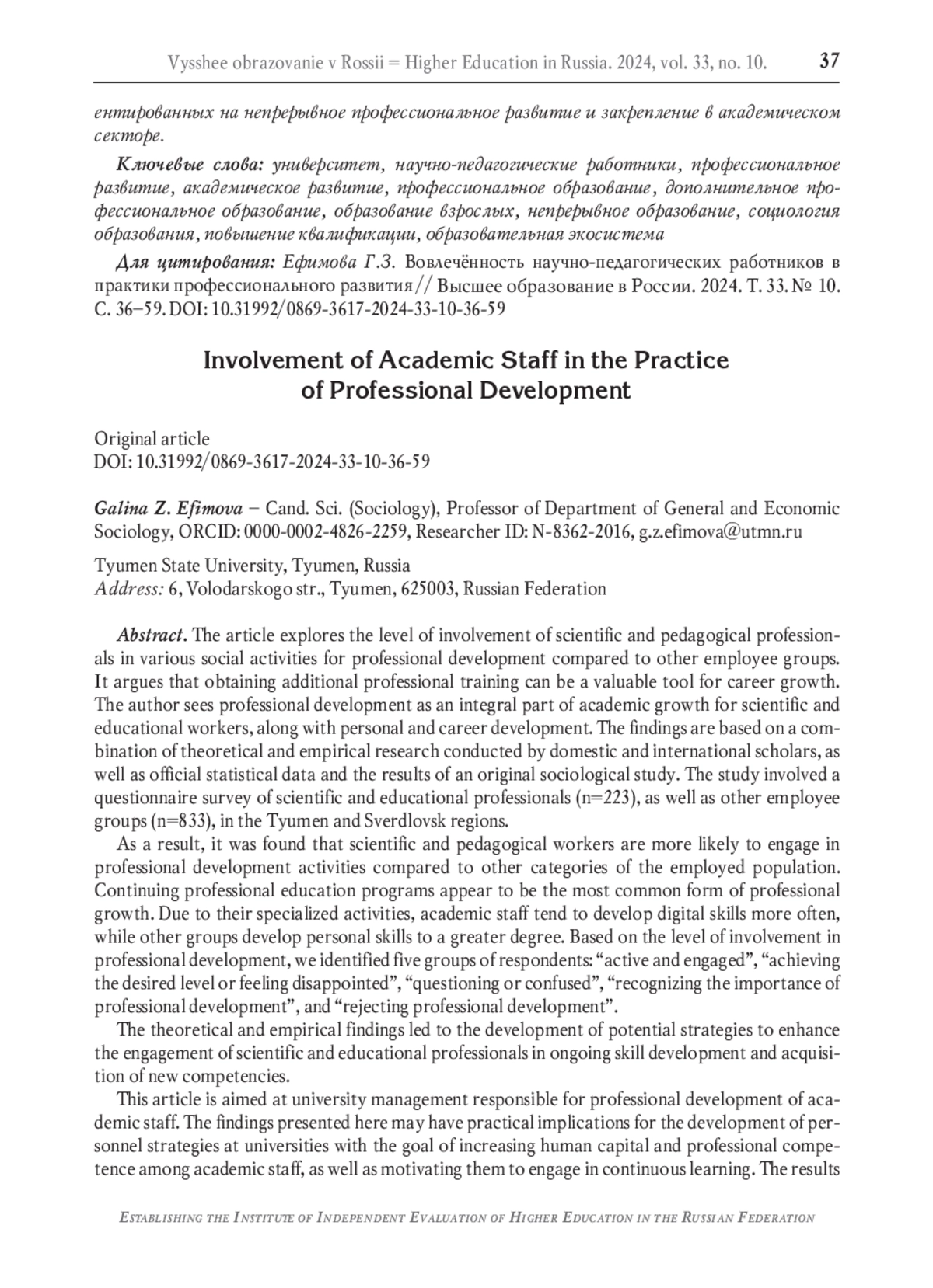 Статья посвящена определению уровня вовлечённости научно-педагогических работников (НПР) в социальные практики профессионального развития в сравнении с иными категориями занятых. В качестве одного из инструментов профессионального развития рассматривается получение дополнительного профессионального образования (ДПО). Профессиональное развитие - составной элемент академического развития НПР, наряду с личностным и карьерным развитием. Выводы основаны на материалах исследований отечественных и зарубежных учёных, официальных статистических наблюдениях, а также на результатах авторского социологического исследования. Исследование проведено с применением метода анкетного опроса научно-педагогических работников (N=223) и иных категорий занятых (N=833) Тюменской и Свердловской областей. В результате исследования подтверждён более высокий уровень вовлечённости НПР в практики профессионального развития, по сравнению с прочими категориями занятого населения. Наиболее распространённая форма профессионального развития - программы ДПО. Из-за специфики своей деятельности НПР чаще развивают цифровые навыки, тогда как другие группы респондентов в большей степени формируют личностные навыки. В зависимости от уровня вовлечённости в практики профессионального развития выделены пять групп респондентов: «активные и вовлечённые», «достигшие желаемого уровня или разочаровавшиеся», «сомневающиеся и дезориентированные», «осознавшие актуальность профессионального развития», «отказывающиеся от профессионального развития». Полученные результаты позволили определить возможные стратегии повышения вовлечённости НПР в непрерывную актуализацию имеющихся профессиональных компетенций и приобретение новых. Статья адресована университетскому менеджменту, ответственному за профессиональное развитие НПР. Исследовательские выводы могут иметь практическое применение при разработке кадровых стратегий в университетах, ориентированных на наращивание человеческого капитала НПР, повышение их профессиональной компетентности и мотивации. Полученные результаты могут быть полезны участникам академической среды и специалистам, занимающимся разработкой образовательных программ и стратегическим развитием университета. Материал представляет интерес для НПР и аспирантов, ориентированных на непрерывное профессиональное развитие и закрепление в академическом секторе.