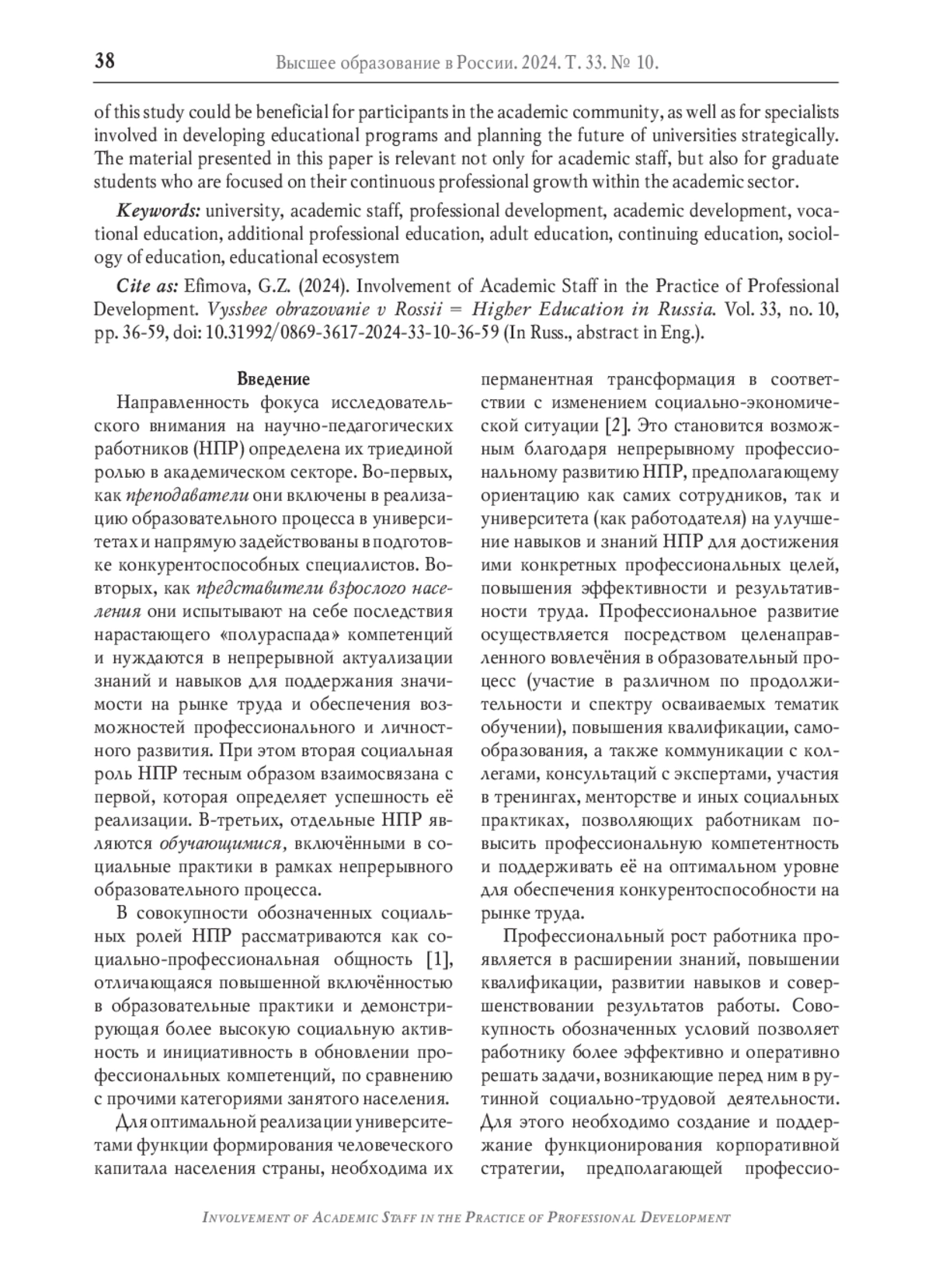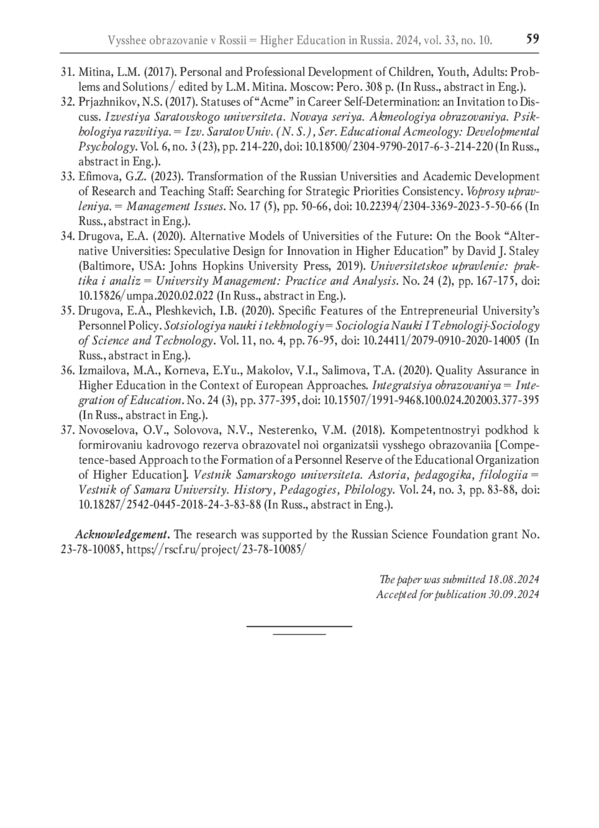 33. Ефимова Г.З. Трансформация российских университетов и академическое развитие научно-педагогических работников: поиски согласования стратегических приоритетов // Вопросы управления. 2023. Т. 17. № 5. С. 50-66. DOI: 10.22394/2304-3369-2023-5-50-66 EDN: BCXHKR