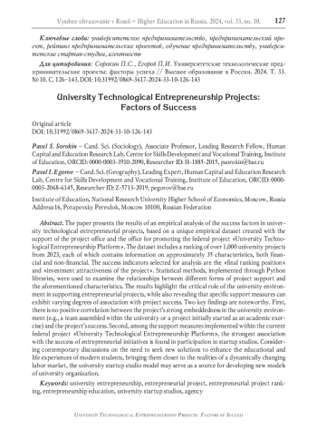 В статье анализируются факторы успешности университетских технологических предпринимательских проектов с опорой на данные, предоставленные офисом популяризации федерального проекта «Платформа университетского технологического предпринимательства». Указанные данные описывают ранжирование более 1000 вузовских проектов (на момент осени 2023 г.) и включают информацию почти о 35 характеристиках, включающих как финансовые, так и нефинансовые аспекты. В качестве индикаторов успешности отобраны «итоговое место в рейтинге» и «инвестиционная привлекательность проекта». С помощью статистических методов библиотеками языка Python изучены взаимосвязи разных форм поддержки проектов с названными характеристиками. Результаты показывают важную роль университетской среды в поддержке предпринимательских проектов, при том, что отдельные меры могут демонстрировать различную по силе связь с успешностью. В качестве ключевых находок следует выделить два наблюдения. Во-первых, отсутствие положительной связи между сильной укоренённостью проекта в вузовской среде (например, команда проекта, собранная в университете, а также статус проекта как изначально учебный) и успешностью проекта. Во-вторых, среди мер поддержки, реализуемых в рамках актуального федерального проекта «Платформа университетского технологического предпринимательства», наиболее тесную связь с успешностью предпринимательских инициатив демонстрирует включённость в работу стартап-студий. Учитывая современные дискуссии о необходимости поиска новых решений для обогащения образовательного и жизненного опыта современных студентов, его приближения к реалиям динамично меняющегося рынка труда, модель университетской стартап-студии может выступать одним из источников для выработки новых моделей организации университетской жизни.