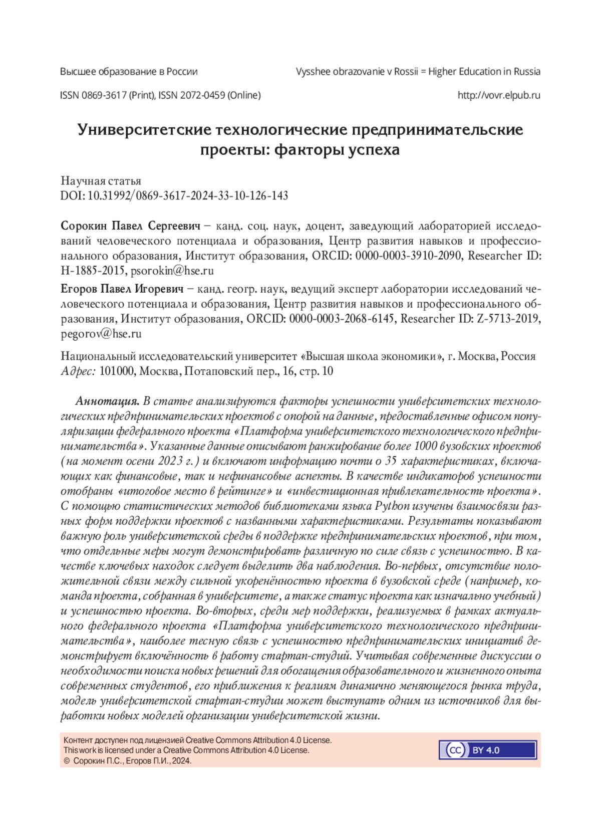 25. Сорокин П., Повалко А., Вятская Ю. Открытые инициативы по обучению предпринимательству: характеристика российского поля // Форсайт. 2021. Т. 15. № 4. С. 22-31. DOI: 10.17323/2500-2597.2021.4.22.31 EDN: CMIUJC