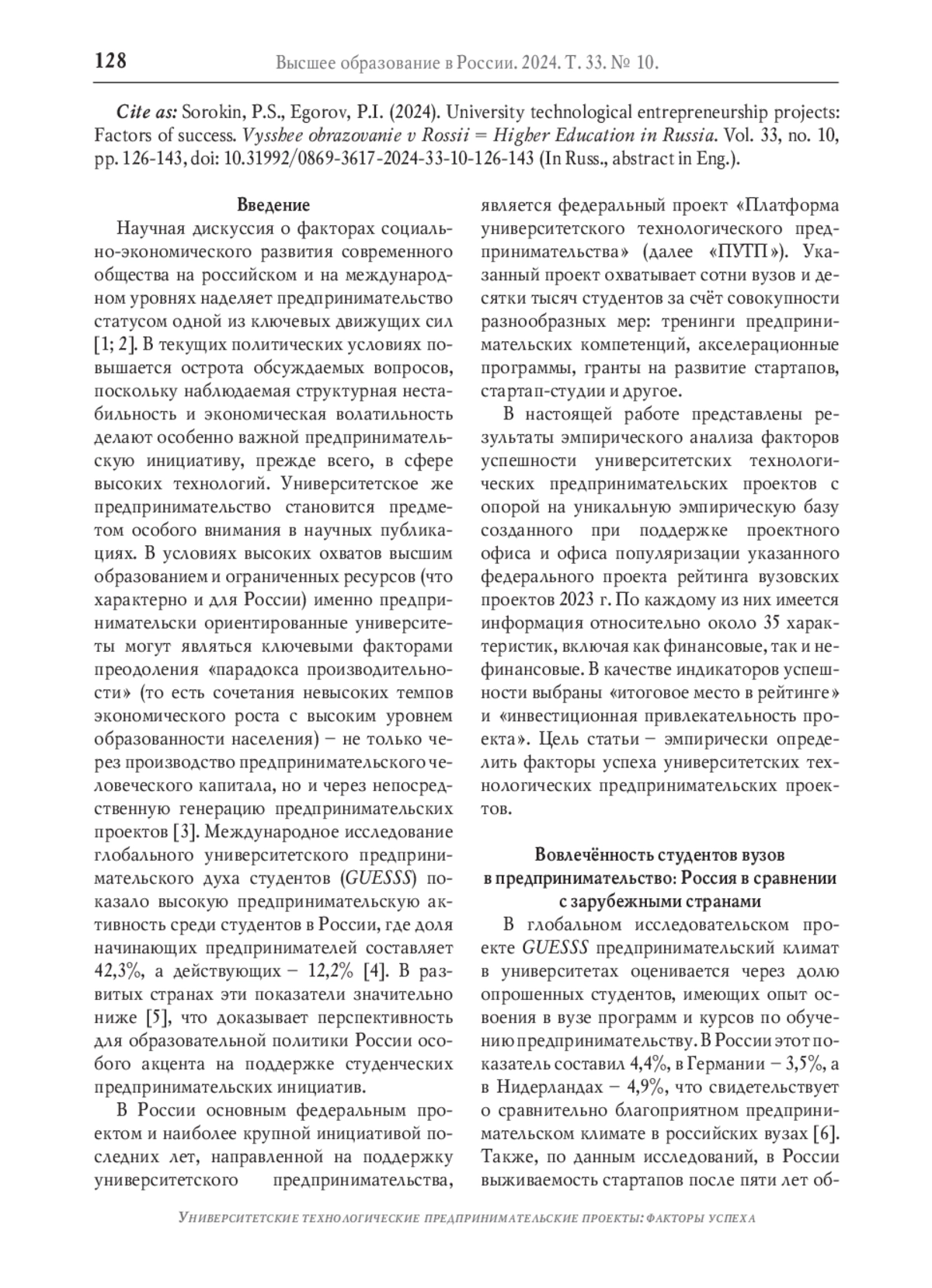 Научная дискуссия о факторах социально-экономического развития современного общества на российском и на международном уровнях наделяет предпринимательство статусом одной из ключевых движущих сил [1; 2]. В текущих политических условиях повышается острота обсуждаемых вопросов, поскольку наблюдаемая структурная нестабильность и экономическая волатильность делают особенно важной предпринимательскую инициативу, прежде всего, в сфере высоких технологий. Университетское же предпринимательство становится предметом особого внимания в научных публикациях.
