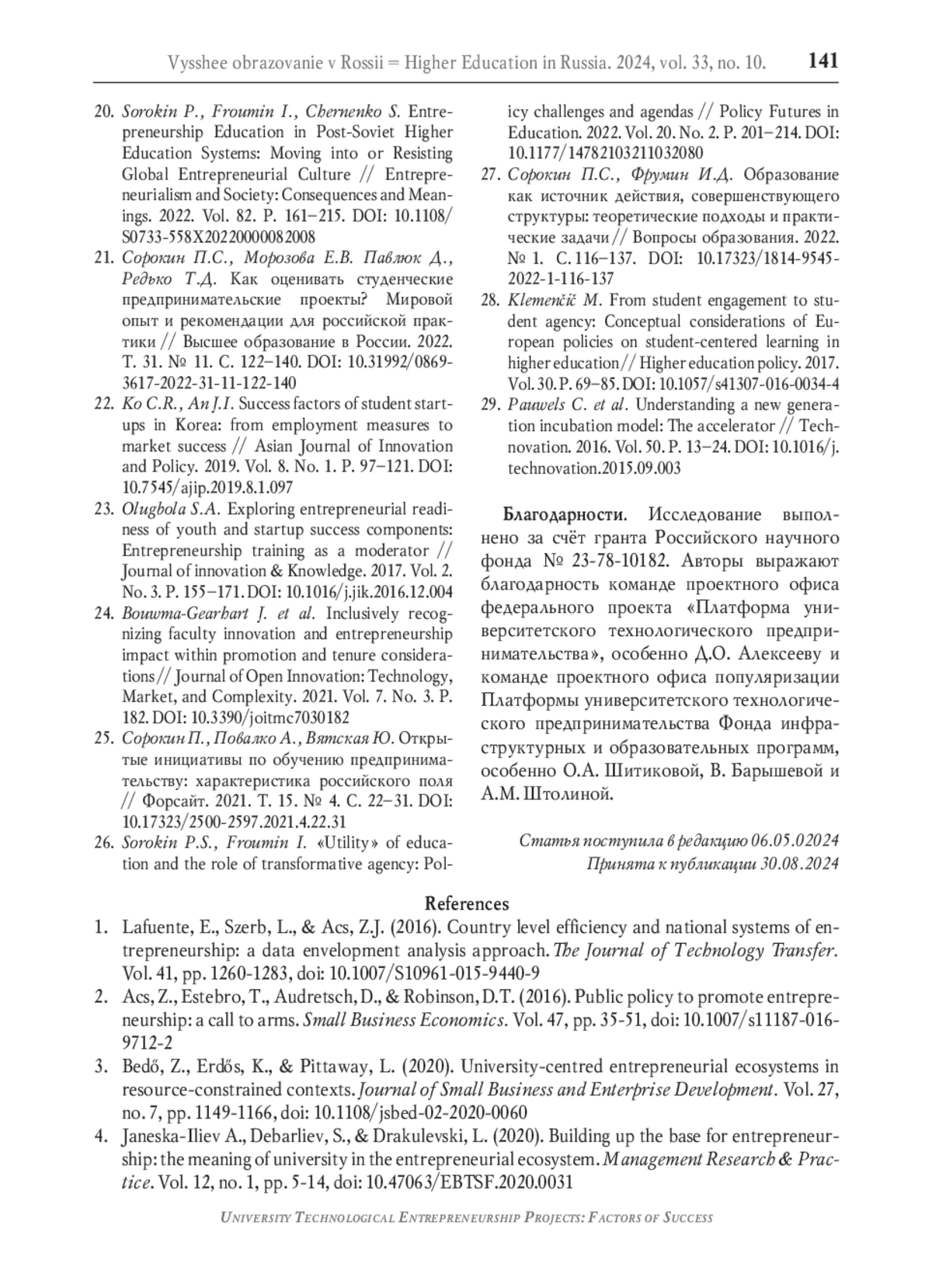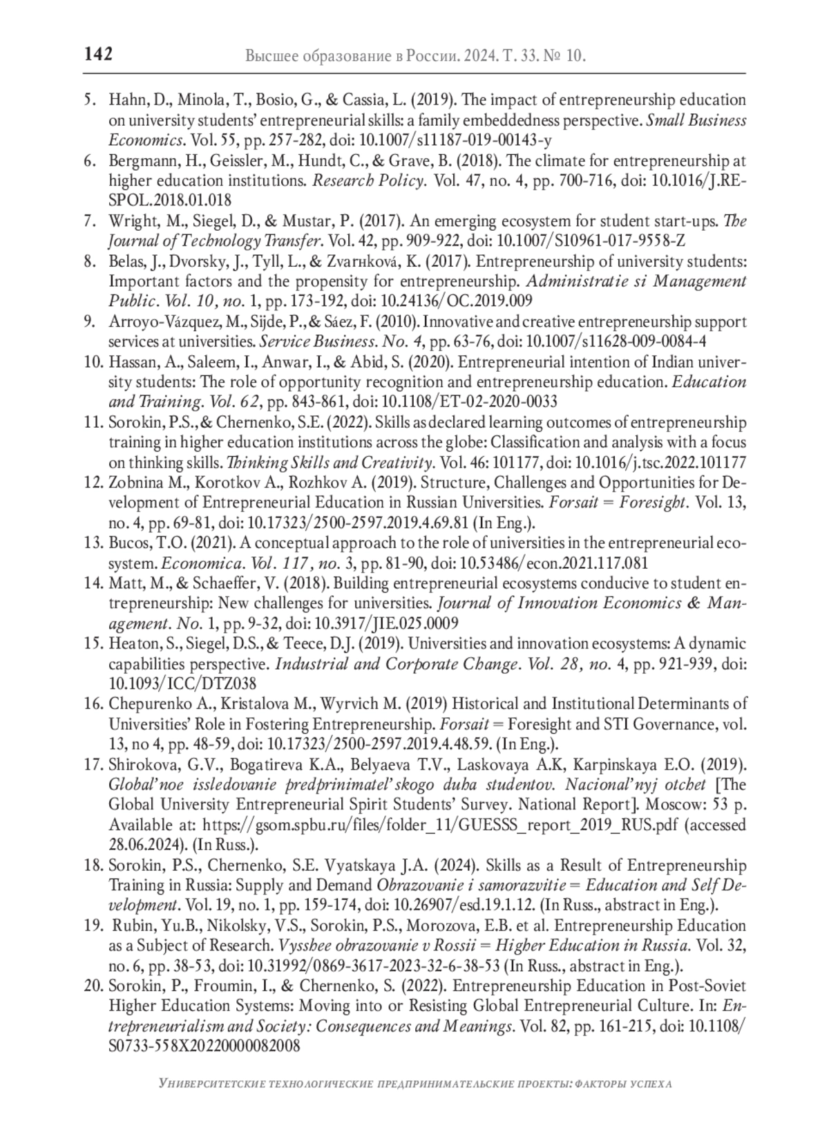 20. Sorokin P., Froumin I., Chernenko S. Entrepreneurship Education in Post-Soviet Higher Education Systems: Moving into or Resisting Global Entrepreneurial Culture // Entrepreneurialism and Society: Consequences and Meanings. 2022. Vol. 82. P. 161-215. DOI: 10.1108/S0733-558X20220000082008