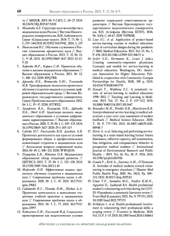 16. Bouzaher M.H., Trinkle D.B., Mutcheson R.B.Interprofessional service learning in medical education: a year-over-year assessment of student feedback // Medical Science Educator. 2020. Т. 30. P. 775-781. DOI: 10.1007/s40670-020-00948-7 EDN: RSDJWU