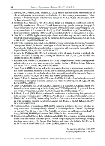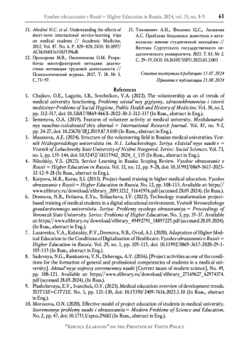 13. Liao S.C. et al. Application of project-based service-learning courses in medical education: trials of curriculum designs during the pandemic // BMC Medical Education. 2023. Vol. 23. No. 1. P. 696. DOI: 10.1186/s12909-023-04671-w EDN: IMHLGU