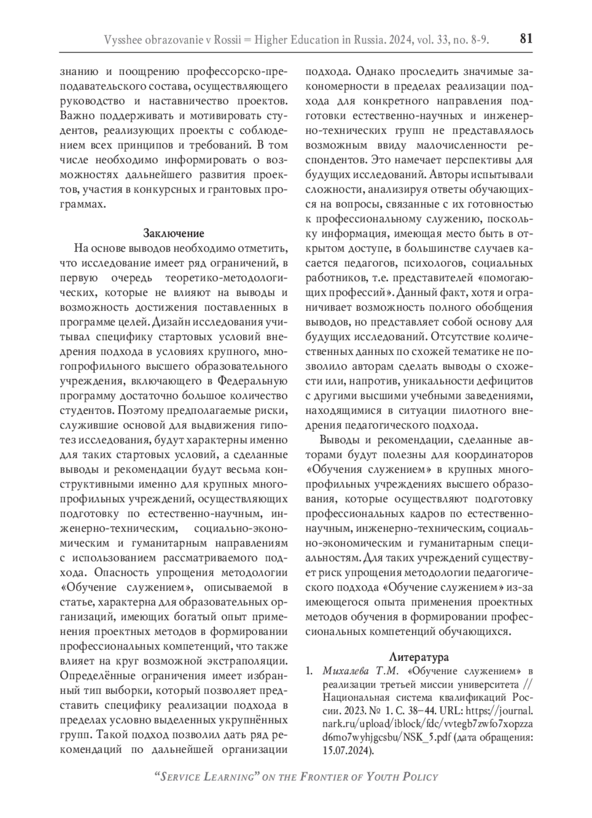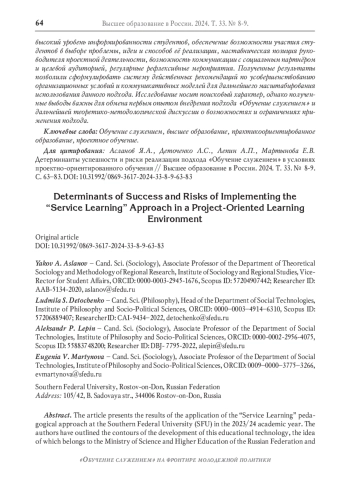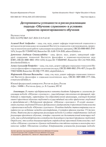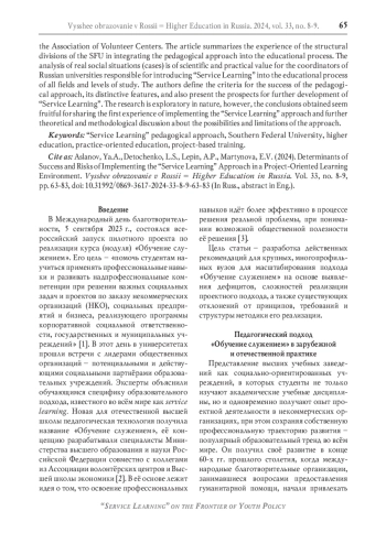 В статье предпринимается попытка выявить дефициты и сложности реализации подхода «Обучение служением», существующие отклонения от принципов, требований и структуры, характерные для образовательной организации, имеющей богатый опыт в проектном обучении студентов и осуществившей массовое привлечение студентов и преподавателей к Федеральной программе «Обучение служением». В основе анализа - опыт участия студентов Южного федерального университета в проектной деятельности с применением подхода «Обучение служением». Основные выводы статьи опираются на эмпирическое исследование методом анкетирования, в котором приняли участие 372 респондента. Выявлены риски упрощения реализации подхода в условиях отработанных моделей реализации проектного обучения, которые снижают как воспитательный потенциал подхода, так и удовлетворённость и готовность дальнейшего участия в программе студентов. Определено, что особого внимания требует сопровождение проектной деятельности с подходом «Обучение служением» в рамках подготовки естественно-научных и инженерно-технических кадров. Обозначены основные детерминанты успешности реализации подхода: высокий уровень информированности студентов, обеспечение возможности участия студентов в выборе проблемы, идеи и способов её реализации, наставническая позиция руководителя проектной деятельности, возможность коммуникации с социальным партнёром и целевой аудиторией, регулярные рефлексивные мероприятия. Полученные результаты позволили сформулировать систему действенных рекомендаций по усовершенствованию организационных условий и коммуникативных моделей для дальнейшего масштабирования использования данного подхода. Исследование носит поисковый характер, однако полученные выводы важны для обмена первым опытом внедрения подхода «Обучение служением» и дальнейшей теоретико-методологической дискуссии о возможностях и ограничениях применения подхода.