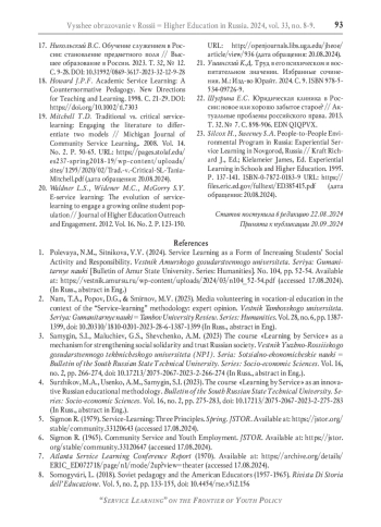 1. Полевая Н.М., Ситникова В.В. Обучение служением“ как форма повышения социальной активности и ответственности студентов // Вестник Амурского государственного университета. Серия: Гуманитарные науки. 2024. № 104. С. 52-54. EDN: YGPAML