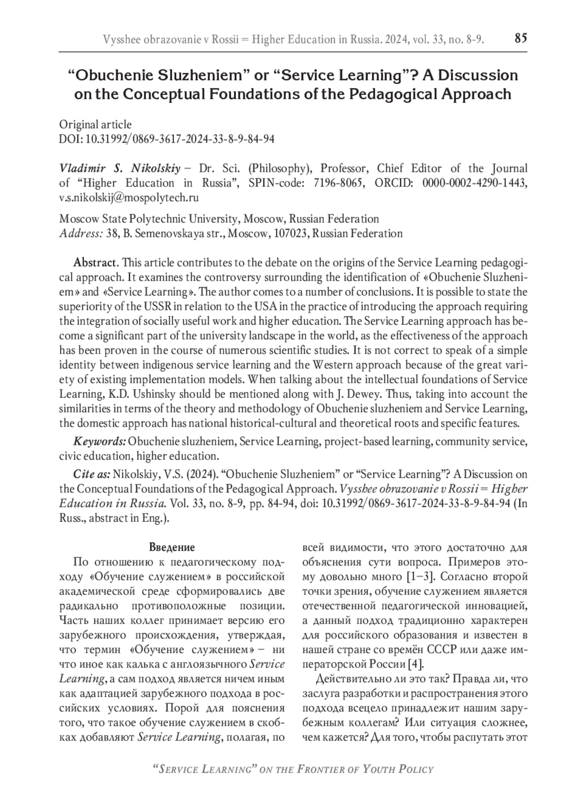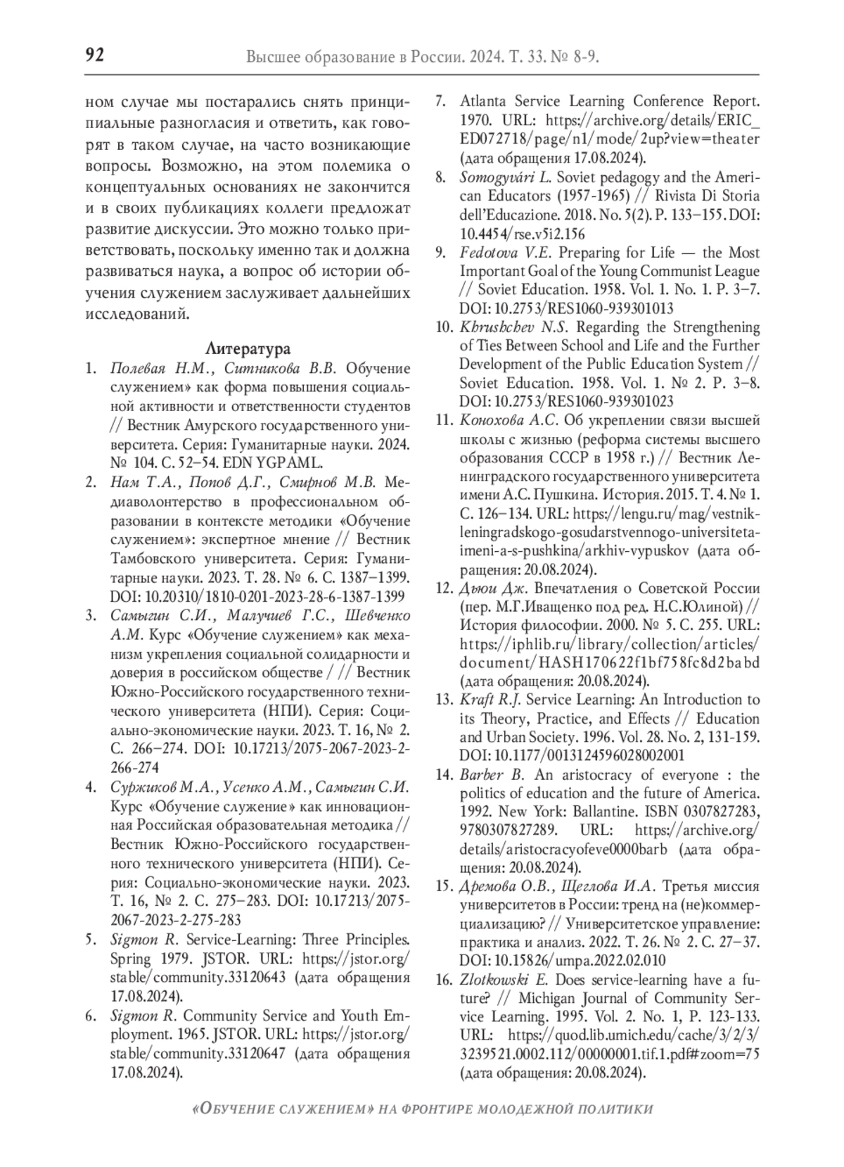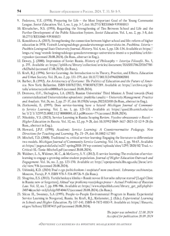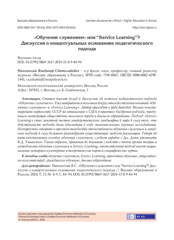 17. Никольский В.С. Обучение служением в России: становление предметного поля // Высшее образование в России. 2023. Т. 32, № 12. С. 9-28. DOI: 10.31992/0869-3617-2023-32-12-9-28 EDN: PWWCVL