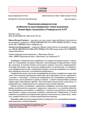 14. Efimov V., Lapteva A. New generation of universities. University 4.0 // Journal of Siberian Federal University. Humanities & Social Sciences. 2016. Vol. 9. No. 11. Pp. 2681-2696. DOI: 10.17516/1997-1370-2016-9-11-2681-2696 EDN: WZQYMZ