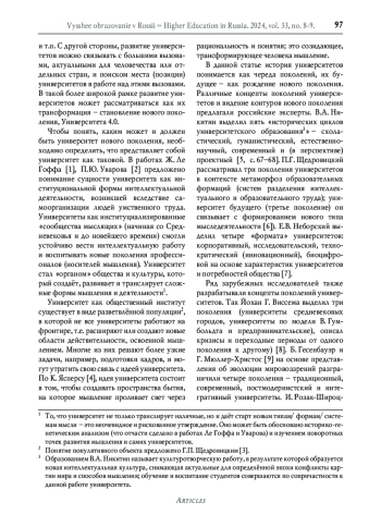 Чтобы понять, каким может и должен быть университет нового поколения, необходимо определить, что представляет собой университет как таковой. В работах Ж. Ле Гоффа [1], П. Ю. Уварова [2] предложено понимание сущности университета как институциональной формы интеллектуальной деятельности, возникшей вследствие самоорганизации людей умственного труда. Университеты как институциализированные «сообщества мыслящих» (начиная со Средневековья и до новейшего времени) смогли устойчиво вести интеллектуальную работу и воспитывать новые поколения профессионалов (носителей мышления). Университет стал «органом» общества и культуры, который создаёт, развивает и транслирует сложные формы мышления и деятельности.