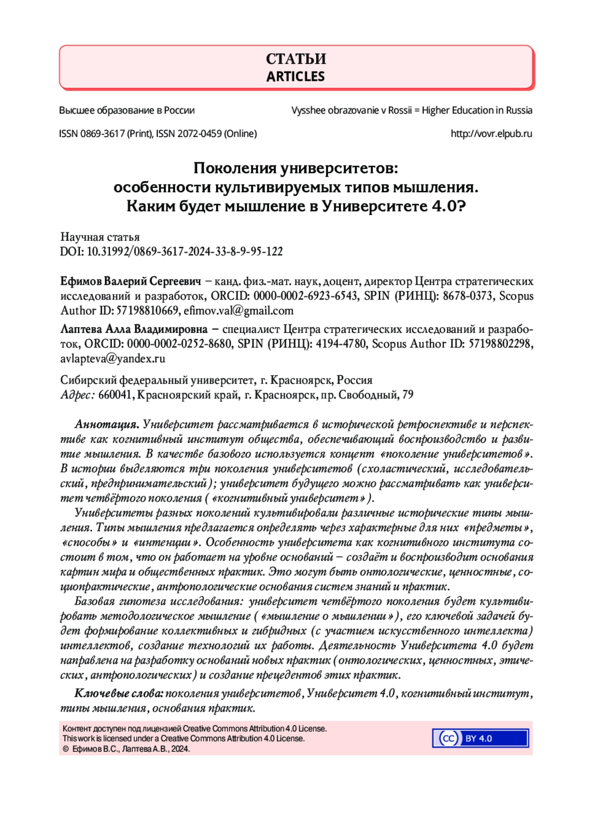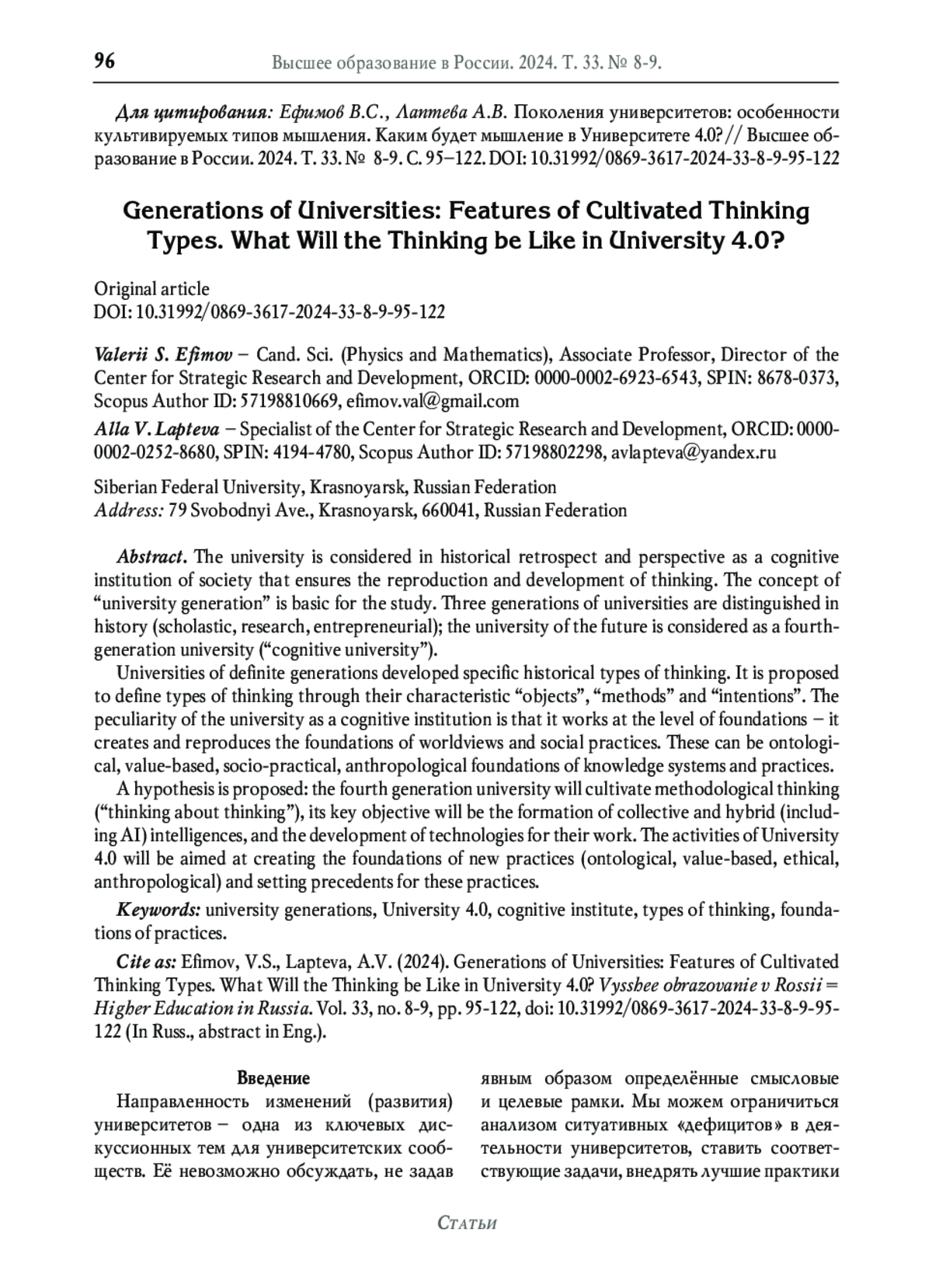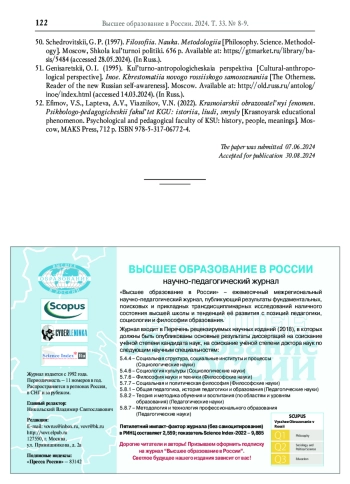 52. Ефимов В.С., Лаптева А.В., Вязников В.Н. Красноярский образовательный феномен. Психолого-педагогический факультет КГУ: история, люди, смыслы. М.: ООО “МАКС Пресс”, 2022. 712 с. ISBN: 978-5-317-06772-4 EDN: QRGEHU