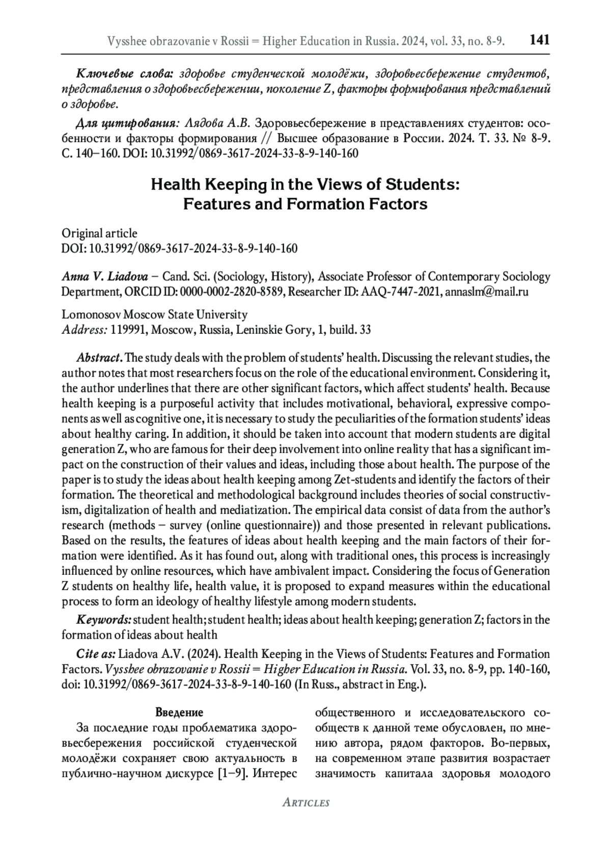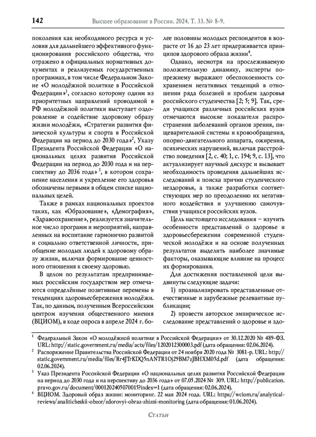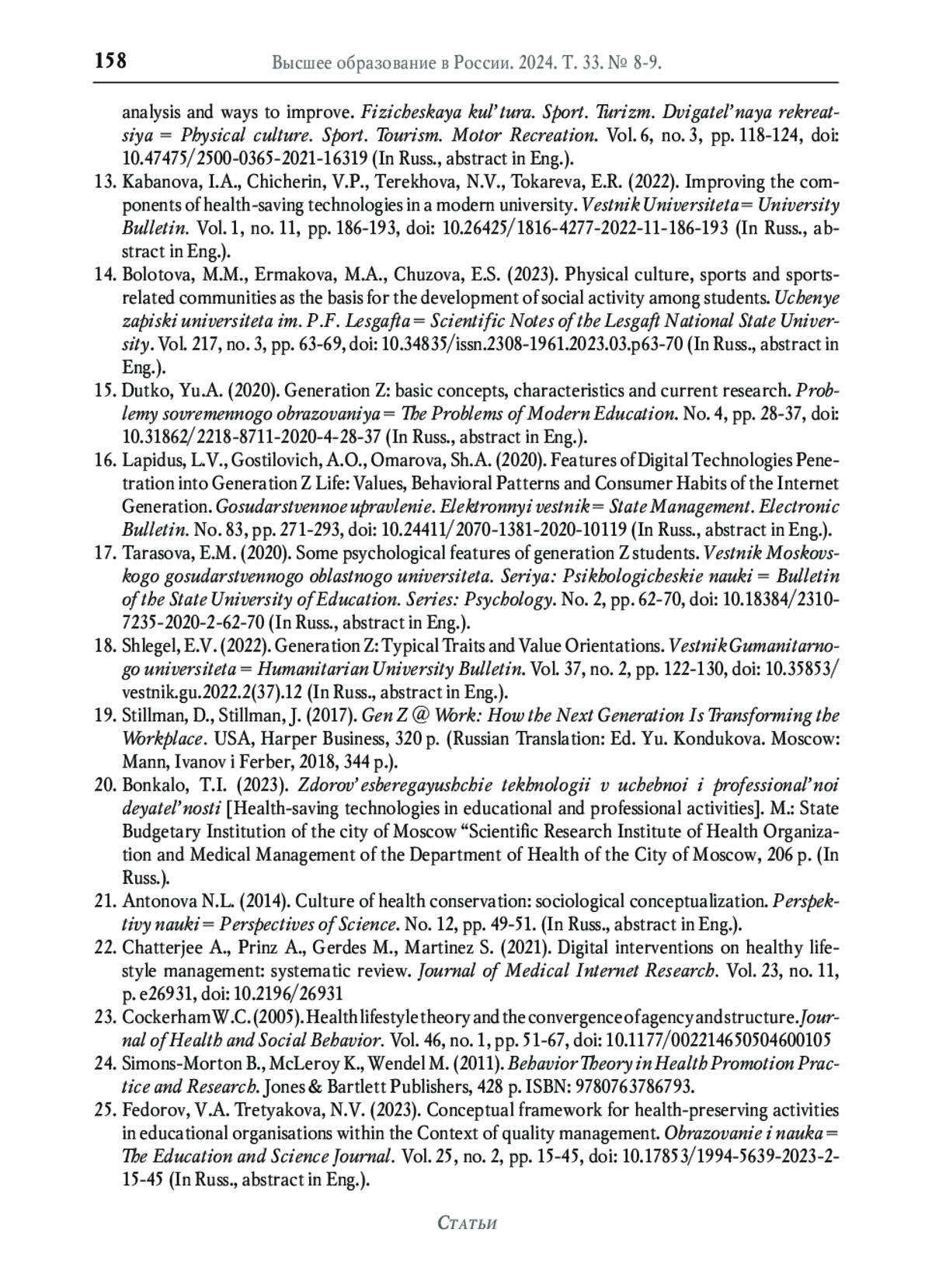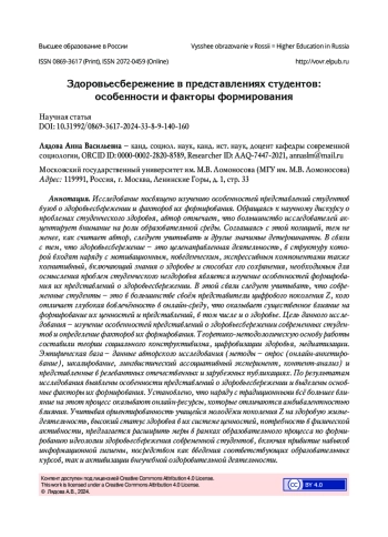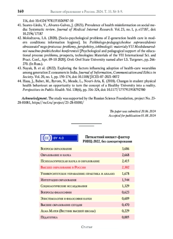 3. Покида А.Н., Зыбуновская Н.В., Газиева И.А. Роль высшего образования в формировании здорового образа жизни (по результатам социологического исследования) // Высшее образование в России. 2022. Т. 31. № 1. С. 72-88. DOI: 10.31992/0869-3617-2022-31-1-72-88 EDN: KLVCPC