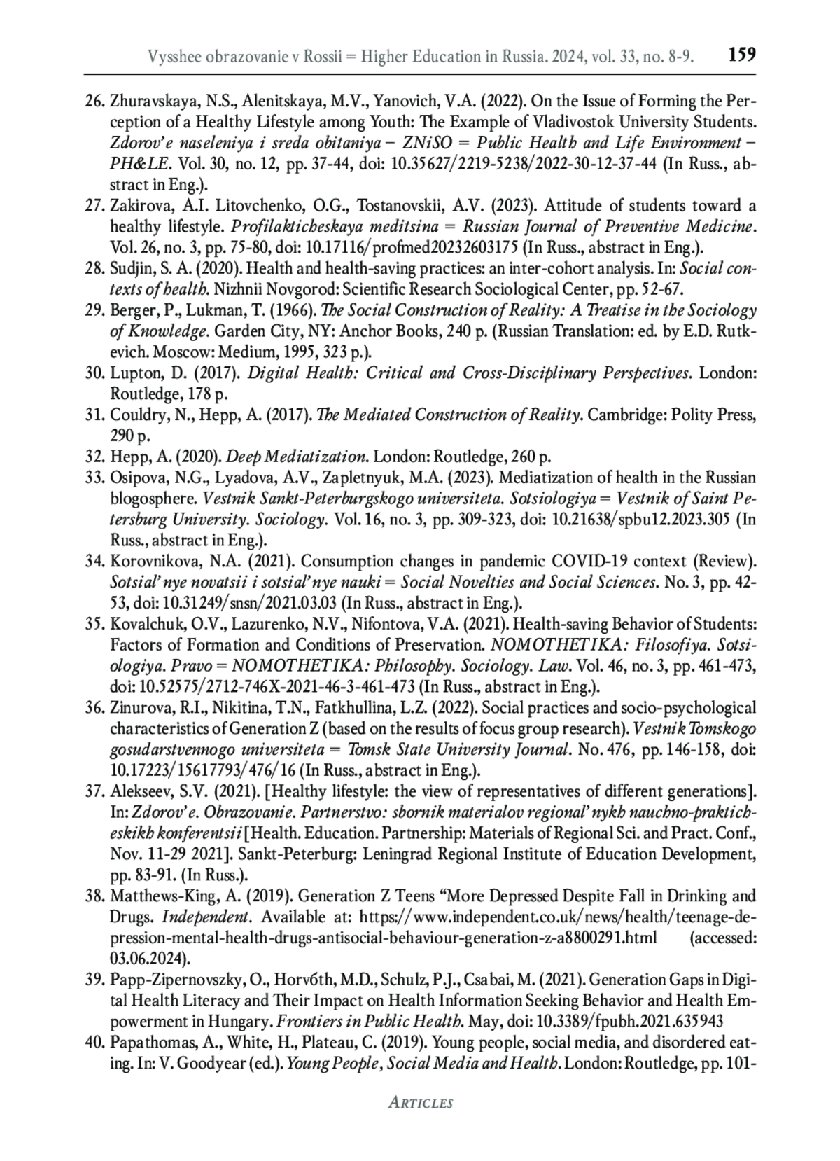 33. Осипова Н. Г., Лядова А. В., Заплетнюк М. А. Медиатизация здоровья в российской блогосфере // Вестник Санкт-Петербургского университета. Социология. 2023. Т. 16(3). С. 309-323. DOI: 10.21638/spbu12.2023.305 EDN: KURUGV
