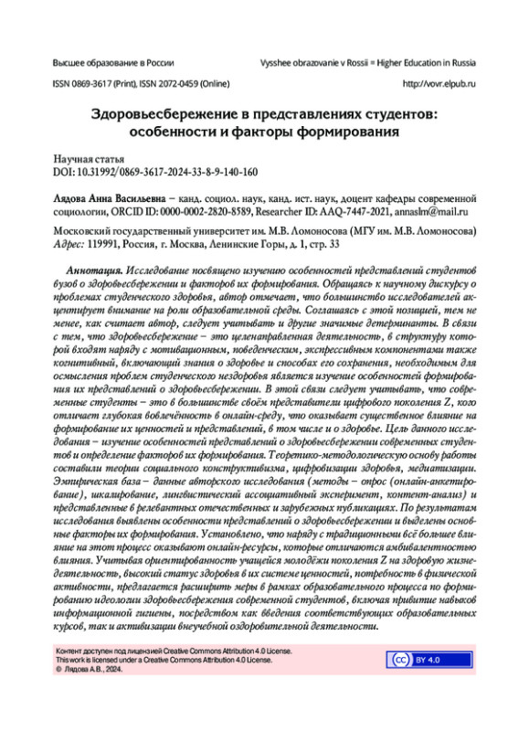 Исследование посвящено изучению особенностей представлений студентов вузов о здоровьесбережении и факторов их формирования. Обращаясь к научному дискурсу о проблемах студенческого здоровья, автор отмечает, что большинство исследователей акцентирует внимание на роли образовательной среды. Соглашаясь с этой позицией, тем не менее, как считает автор, следует учитывать и другие значимые детерминанты. В связи с тем, что здоровьесбережение - это целенаправленная деятельность, в структуру которой входят наряду с мотивационным, поведенческим, экспрессивным компонентами также когнитивный, включающий знания о здоровье и способах его сохранения, необходимым для осмысления проблем студенческого нездоровья является изучение особенностей формирования их представлений о здоровьесбережении. В этой связи следует учитывать, что современные студенты - это в большинстве своём представители цифрового поколения Z, кого отличает глубокая вовлечённость в онлайн-среду, что оказывает существенное влияние на формирование их ценностей и представлений, в том числе и о здоровье. Цель данного исследования - изучение особенностей представлений о здоровьесбережении современных студентов и определение факторов их формирования. Теоретико-методологическую основу работы составили теории социального конструктивизма, цифровизации здоровья, медиатизации. Эмпирическая база - данные авторского исследования (методы - опрос (онлайн-анкетирование), шкалирование, лингвистический ассоциативный эксперимент, контент-анализ) и представленные в релевантных отечественных и зарубежных публикациях. По результатам исследования выявлены особенности представлений о здоровьесбережении и выделены основные факторы их формирования. Установлено, что наряду с традиционными всё большее влияние на этот процесс оказывают онлайн-ресурсы, которые отличаются амбивалентностью влияния. Учитывая ориентированность учащейся молодёжи поколения Z на здоровую жизнедеятельность, высокий статус здоровья в их системе ценностей, потребность в физической активности, предлагается расширить меры в рамках образовательного процесса по формированию идеологии здоровьесбережения современной студентов, включая привитие навыков информационной гигиены, посредством как введения соответствующих образовательных курсов, так и активизации внеучебной оздоровительной деятельности.
