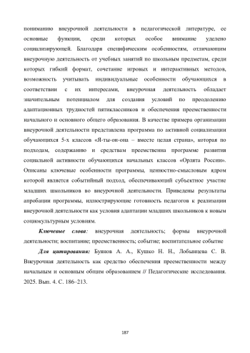В статье рассматривается воспитательный потенциал внеурочной деятельности в общеобразовательных организациях на стыке начального и основного уровней общего образования. Обобщены подходы к пониманию внеурочной деятельности в педагогической литературе, ее основные функции, среди которых особое внимание уделено социализирующей. Благодаря специфическим особенностям, отличающим внеурочную деятельность от учебных занятий по школьным предметам, среди которых гибкий формат, сочетание игровых и интерактивных методов, возможность учитывать индивидуальные особенности обучающихся в соответствии с их интересами, внеурочная деятельность обладает значительным потенциалом для создания условий по преодолению адаптационных трудностей пятиклассников и обеспечения преемственности начального и основного общего образования. В качестве примера организации внеурочной деятельности представлена программа по активной социализации обучающихся 5-х классов «Я-ты-он-она - вместе целая страна», которая по подходам, содержанию и средствам преемственна программе развития социальной активности обучающихся начальных классов «Орлята России». Описаны ключевые особенности программы, ценностно-смысловым ядром которой является событийный подход, обеспечивающий субъектное участие младших школьников во внеурочной деятельности. Приведены результаты апробации программы, иллюстрирующие готовность педагогов к реализации внеурочной деятельности как условия адаптации младших школьников к новым социокультурным условиям.