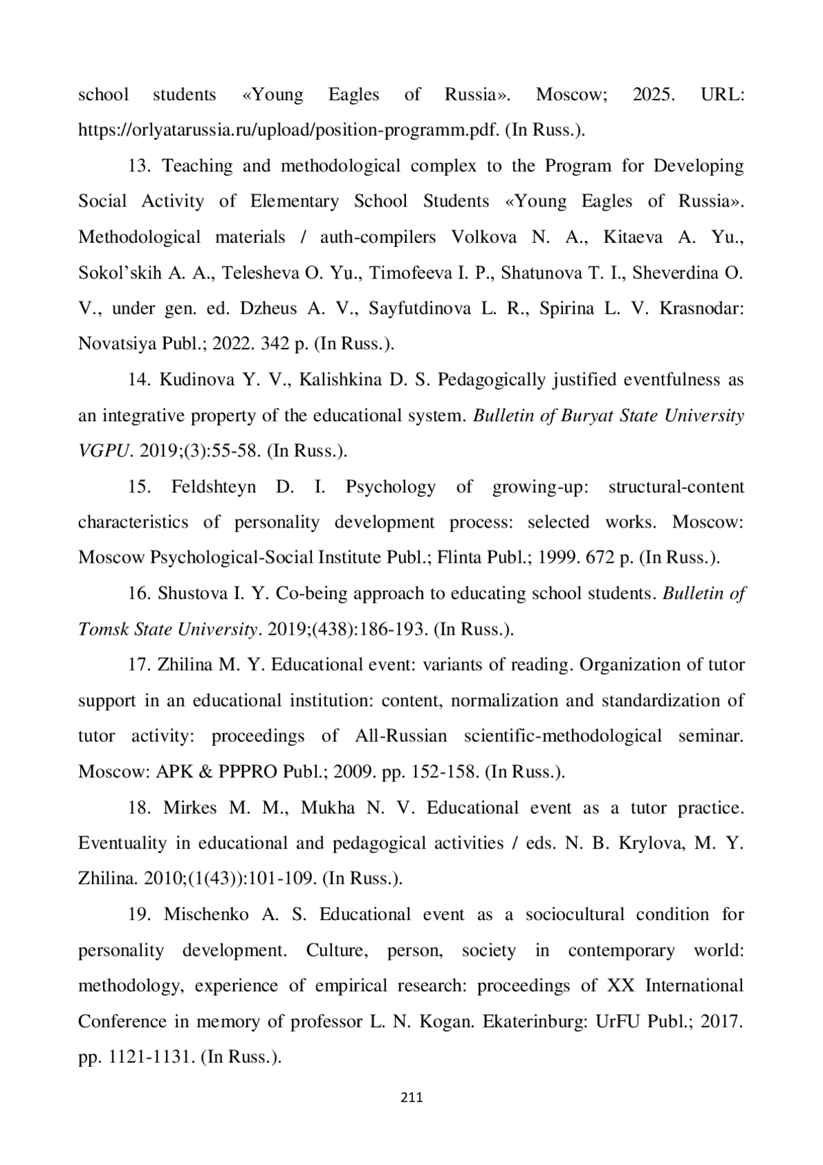 14. Кудинова Ю. В., Калишкина Д. С. Педагогически обоснованная событийность как интегративное свойство воспитательной системы // Известия ВГПУ. № 3. 2019. С. 55-58.