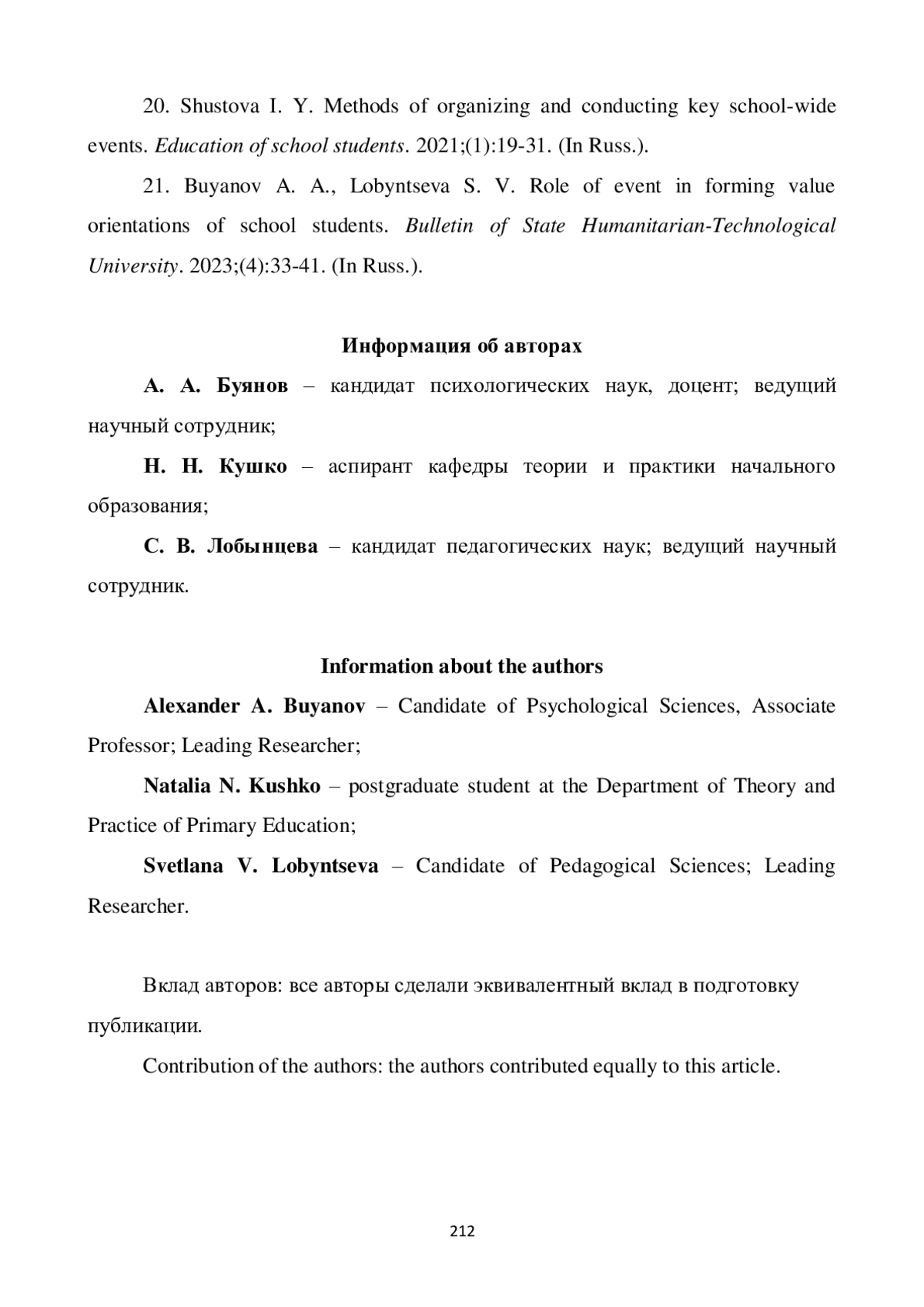 21. Буянов А. А., Лобынцева С. В. Роль события в формировании ценностных ориентаций школьников // Вестник Государственного гуманитарно-технологического университета. 2023. № 4. С. 33-41. EDN: TFOEVM
