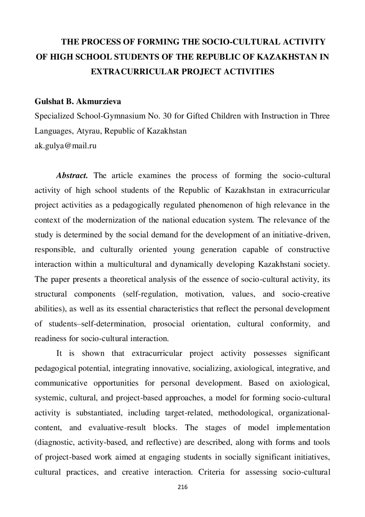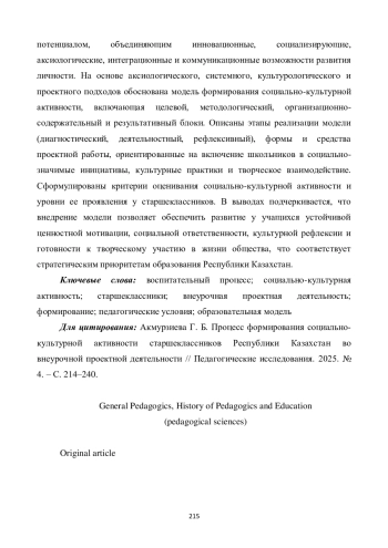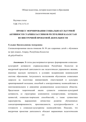 В статье рассматривается процесс формирования социально-культурной активности старшеклассников Республики Казахстан во внеурочной проектной деятельности как педагогически управляемое явление, имеющее высокую значимость в условиях модернизации национальной системы образования. Актуальность исследования обусловлена социальным запросом на подготовку инициативной, ответственной и культурно ориентированной молодежи, способной к конструктивному взаимодействию в многонациональном и динамично развивающемся казахстанском обществе. Представлен теоретический анализ сущности социально-культурной активности, ее структурных компонентов (саморегуляции, мотивации, ценностей, социально-творческих способностей), а также сущностных характеристик, выражающих личностное развитие обучающихся: самодетерминированности, просоциальности, культуросообразности и готовности к социально-культурному взаимодействию. Показано, что внеурочная проектная деятельность обладает выраженным педагогическим потенциалом, объединяющим инновационные, социализирующие, аксиологические, интеграционные и коммуникационные возможности развития личности. На основе аксиологического, системного, культурологического и проектного подходов обоснована модель формирования социально-культурной активности, включающая целевой, методологический, организационно-содержательный и результативный блоки. Описаны этапы реализации модели (диагностический, деятельностный, рефлексивный), формы и средства проектной работы, ориентированные на включение школьников в социально-значимые инициативы, культурные практики и творческое взаимодействие. Сформулированы критерии оценивания социально-культурной активности и уровни ее проявления у старшеклассников. В выводах подчеркивается, что внедрение модели позволяет обеспечить развитие у учащихся устойчивой ценностной мотивации, социальной ответственности, культурной рефлексии и готовности к творческому участию в жизни общества, что соответствует стратегическим приоритетам образования Республики Казахстан.