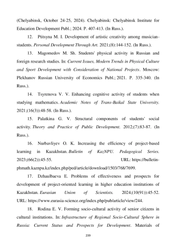 17. Dzhaulbaeva E. Problems of effectiveness and prospects for development of project-oriented learning in higher education institutions of Kazakhstan // Eurasian Union of Scientists. 2024. No. 10 (91). P. 45-52. URL: https://www.eurasia-science.org/index.php/pub/article/view/244.
