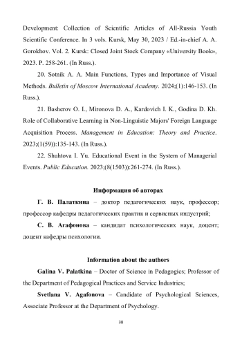 22. Шустова И. Ю. Воспитательное событие в системе управленческого события // Народное образование. 2023. № 8 (1503). С. 261-274.