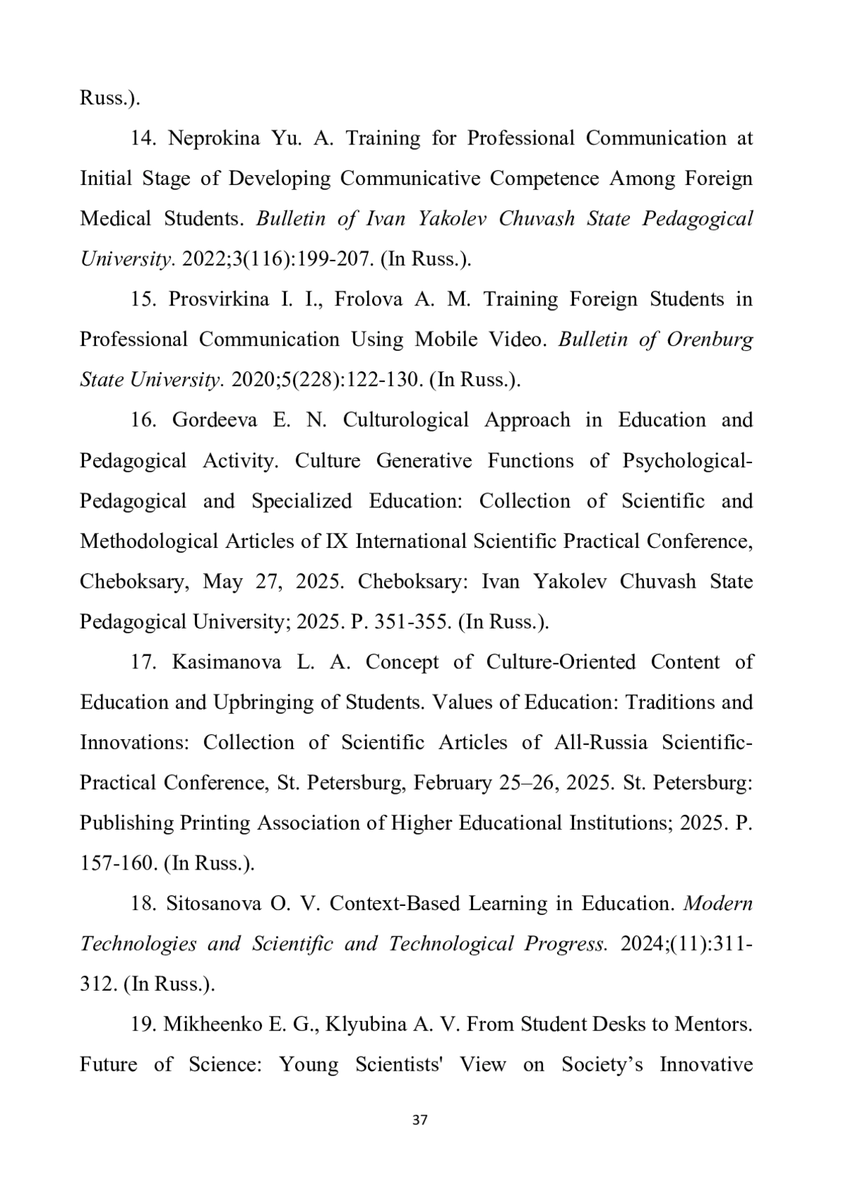 14. Непрокина Ю. А. Обучение профессиональному общению на начальном этапе формирования коммуникативной компетенции иностранных студентов-медиков // Вестник Чувашского государственного педагогического университета им. И. Я. Яковлева. 2022. Т. 3, № 116. С. 199-207.