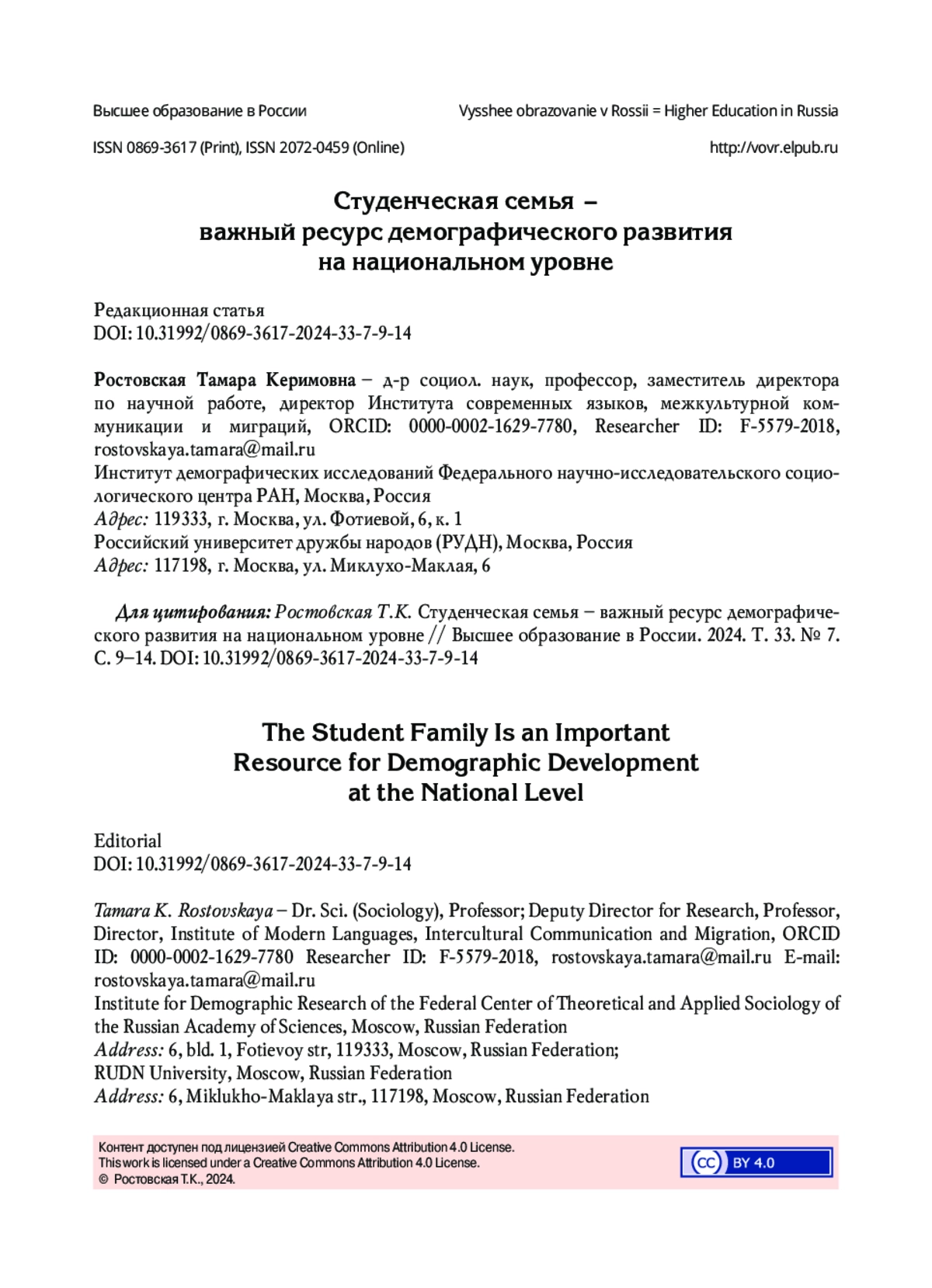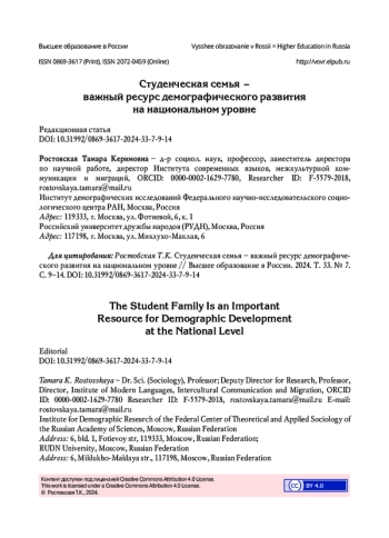 Тематический раздел данного номера журнала «Семья как ключевой объект демографической политики и научных исследований» посвящён вопросам развития семьи в контексте государственной демографической политики и приурочен к проведению V Всероссийского демографического форума с международным участием (далее – Форум), который состоится 23–28 сентября 2024 года в Сочинском институте (филиале) Российского университета дружбы народов имени Патриса Лумумбы. Организаторы Форума – Институт демографических исследований Федерального научно-исследовательского социологического центра Российской академии наук и Российский университет дружбы народов имени Патриса Лумумбы.