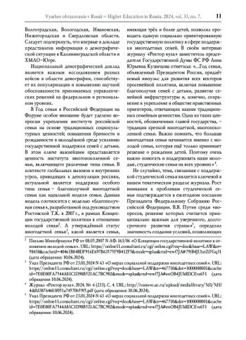3. Указ Президента РФ от 23.01.2024 N 63 “О мерах социальной поддержки многодетных семей”. URL: https://online11.consultant.ru/cgi/online.cgi?req=doc&base=LAW&n=467710&dst=1000000001&cacheid=7E0E00FA7544A81C1D98B521AC7BC902&mode=splus&rnd=ewf7JA#enOB4JUkRDCEvz651 (дата обращения 10.06.2024).