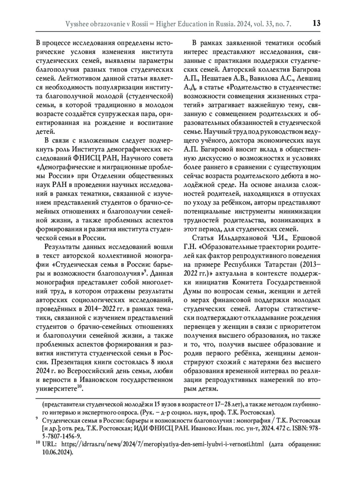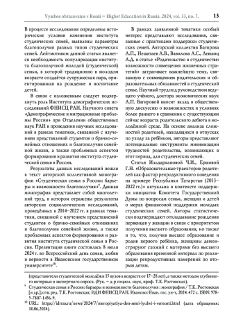 9. Студенческая семья в России: барьеры и возможности благополучия: монография / Т.К. Ростовская [и др.]; отв. ред. Т.К. Ростовская; ИДИ ФНИСЦ РАН. Иваново: Иван. гос. ун-т, 2024. 472 с. ISBN: 978-5-7807-1456-9 EDN: NIKQQJ