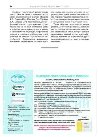 Демографические вызовы, с которыми столкнулась сегодня Россия, требуют всё новых и новых мер, направленных на повышение рождаемости. В условиях повышения возраста родителей при рождении первенца у современной молодёжи устойчивы представления о том, что возраст 18-24 года не является «подходящим» для деторождения. Проведённый авторами обзор существующих и предлагаемых мер поддержки студенческих семей позволяет говорить об активном развитии этой сферы. Выделены ключевые направления реализуемой и планируемой поддержки: помощь студенческим семьям в решении жилищных вопросов; финансовая поддержка студентов-родителей; организационные меры, направленные на совмещение родительских и образовательных обязанностей. Наш анализ был сфокусирован на проблеме создания необходимых условий для реализации молодёжью родительской жизненной стратегии в период студенчества. Целью исследования стала разработка потенциальных инструментов минимизации трудностей родительства, возникающих в период отпуска по уходу за ребёнком, для студенческих семей. Для достижения цели были поставлены две задачи: выявление совокупности сложностей и противоречий, переживаемых родителями в период отпуска по уходу за ребёнком, и разработка на основе полученных результатов предложений, направленных на повышение рождаемости у студентов в период получения ими высшего образования. Методом исследования выступили полуформализированные интервью с 40 родителями, семьи которых используют право на отпуск по уходу за ребёнком. По результатам анализа выявлены сложности двух уровней: институциональный (трудности связаны с государственным регулированием, состоянием инфраструктуры, рынком труда) и личностный (социальные установки, отношения с окружением, состояние здоровья). Для студентов-родителей ситуация в период декретного отпуска представляется ещё более сложной, а поддержка - более востребованной. На основании этого разработаны рекомендации, которые направлены на смягчение трудностей студенческих семей, находящихся в отпуске по уходу за ребёнком, и могут быть реализованы в системе российского высшего образования.