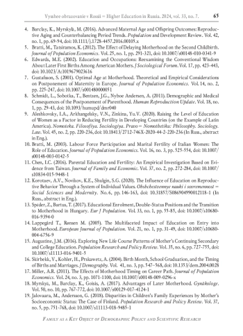 13. Spéder Z., Bartus T. Educational Enrolment, Double-Status Positions and the Transition to Motherhood in Hungary // European Journal of Population. 2017. Vol. 33. No. 1. P. 55-85. DOI: 10.1007/s10680-016-9394-0