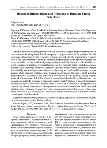 Недобросовестное поведение исследователей является важной проблемой для науки во многих странах, в том числе и в России. Оно приводит к негативным последствиям как для качества получаемого научного знания, так и для репутации исследователей и научных организаций. Однако до сих пор проведено небольшое число эмпирических исследований этой проблемы в России. В работе методом опроса исследуются представления молодых учёных из всех федеральных округов России об исследовательской этике и ситуациях, с которыми они сталкиваются в своей работе. В соответствии с выбранной теоретической рамкой: представлениями об этике как действии, которое носит ситуативный характер, определяется устойчивыми практиками и образцами, опрос проводился в два этапа: сначала был задан открытый вопрос о ситуациях этического выбора в исследовательской деятельности, на основе которого затем была создана развёрнутая анкета. В результате было выявлено, что подавляющее большинство молодых исследователей сталкиваются с ситуациями нарушения этических норм как в научных публикациях и коммуникациях, так и в процессах организации исследовательской работы. Нарушения исследовательских процедур, подгонка данных, фальсификация результатов исследований - это набор нарушений в организации исследований, с которым сталкивались почти три четверти респондентов сами или слышали о таких ситуациях от коллег. При этом нет консенсуса относительно источников знаний об этике и наблюдается дефицит таких институциональных практик регулирования нарушений как работа этических комитетов или этические стандарты.