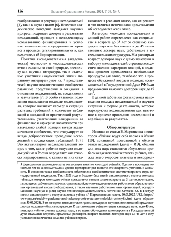 Категория «молодые исследователи» в данной работе определяется как специалисты в возрасте до 35 лет со степенью кандидата наук или без степени и до 45 лет со степенью доктора наук, работающие в исследовательских структурах. Мы расширили возраст докторов наук с целью включения в выборку и исследователей, стремящихся достичь высоких карьерных позиций, в недавнем прошлом преодолевших необходимые процедуры для этого, тем более что в процессе обсуждений возраста молодых исследователей в Государственной Думе РФ были предложения включить докторов наук до 45 лет.