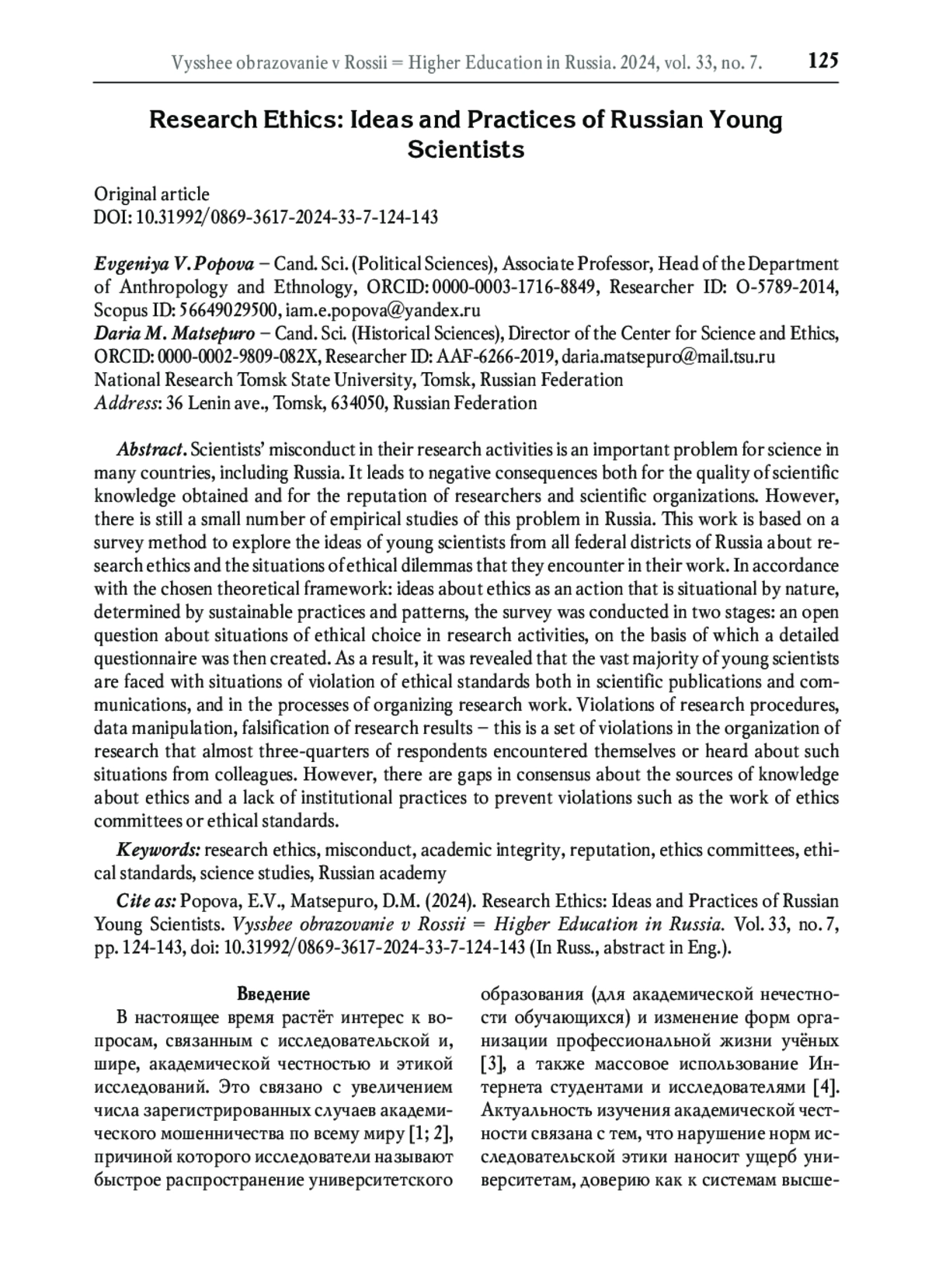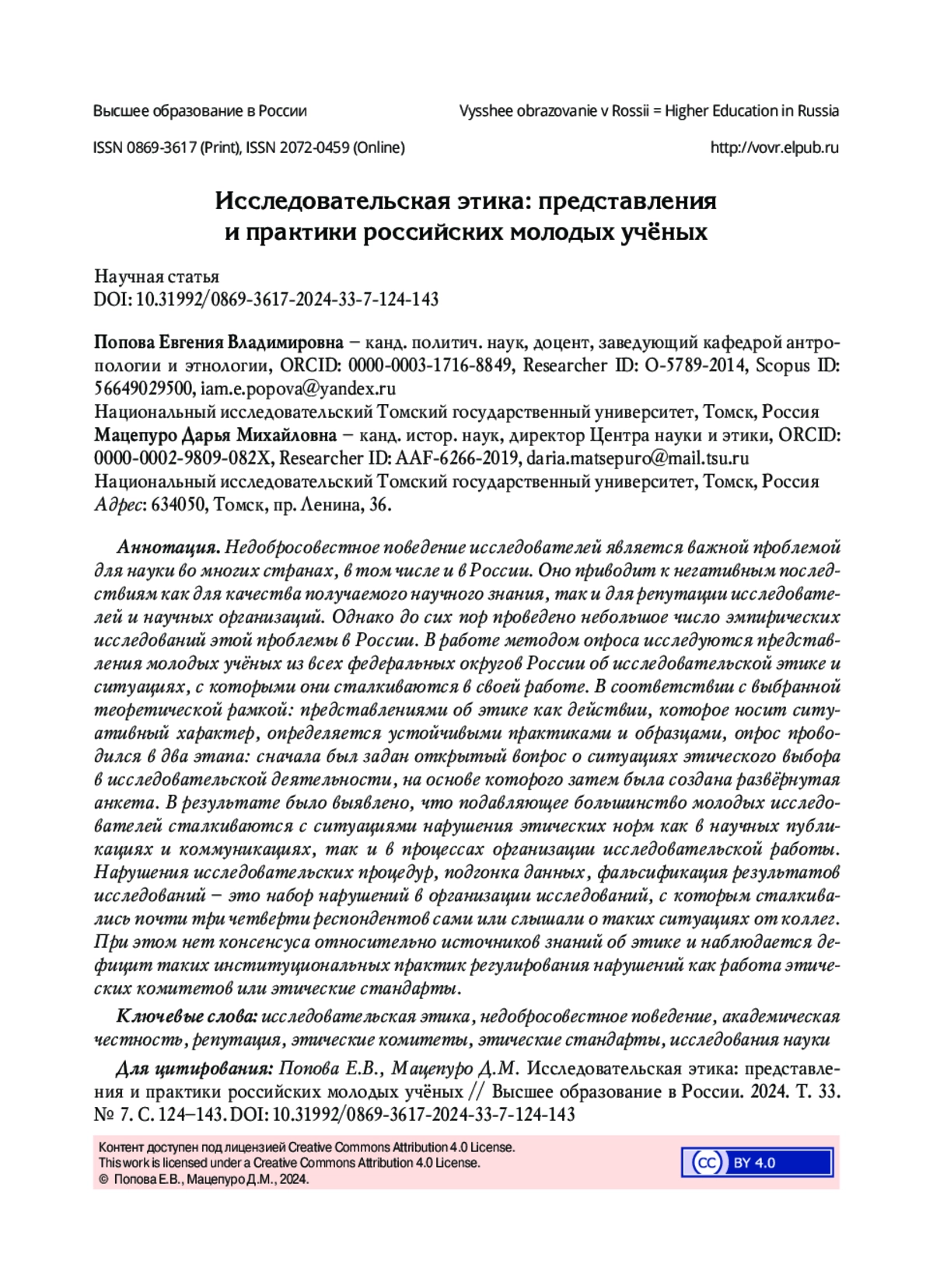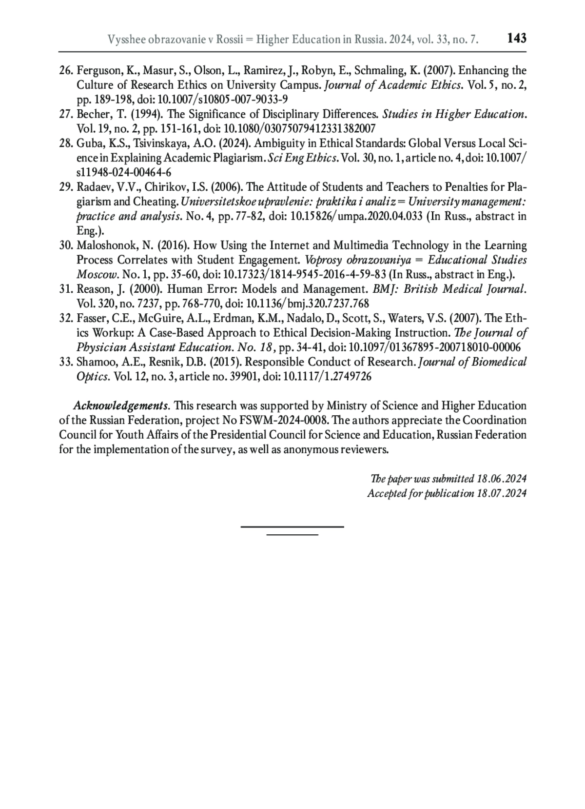 28. Guba K.S., Tsivinskaya A.O. Ambiguity in Ethical Standards: Global Versus Local Science in Explaining Academic Plagiarism // Sci Eng Ethics. 2024. Vol. 30 No. 1. Article no. 4. DOI: 10.1007/s11948-024-00464-6 EDN: BQJZWN