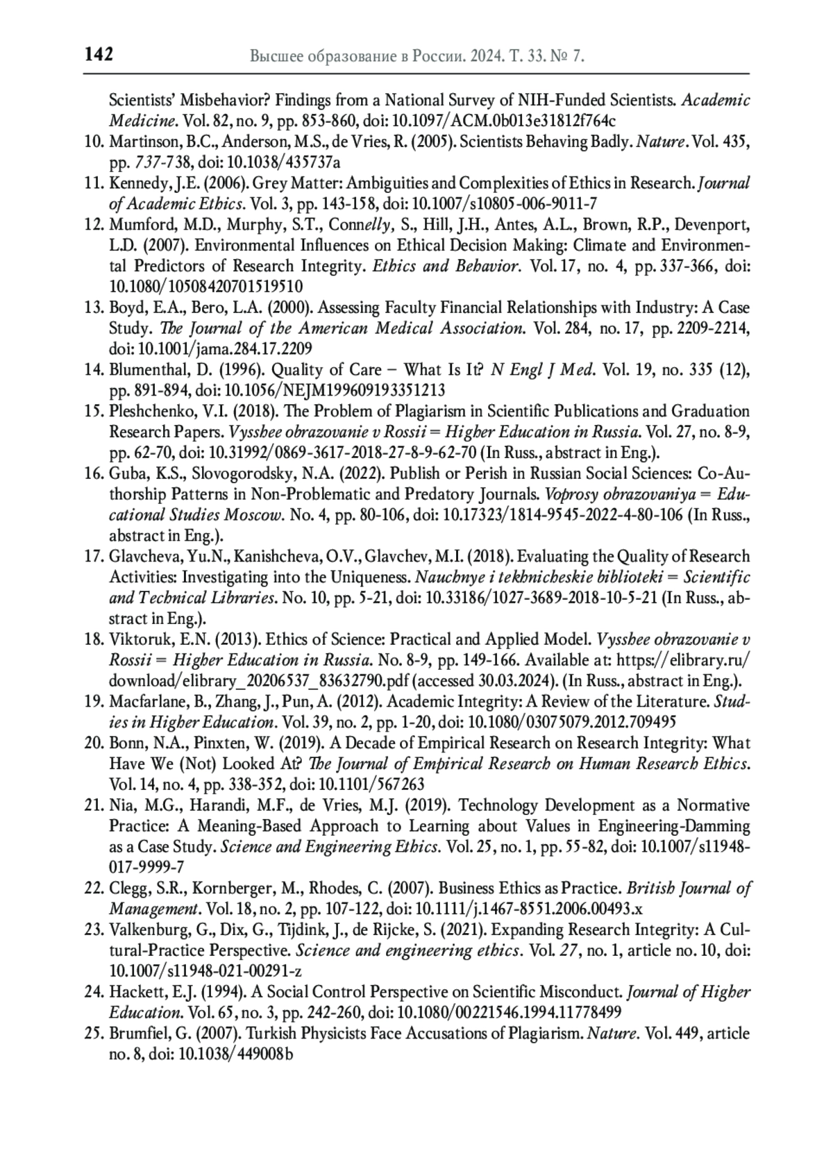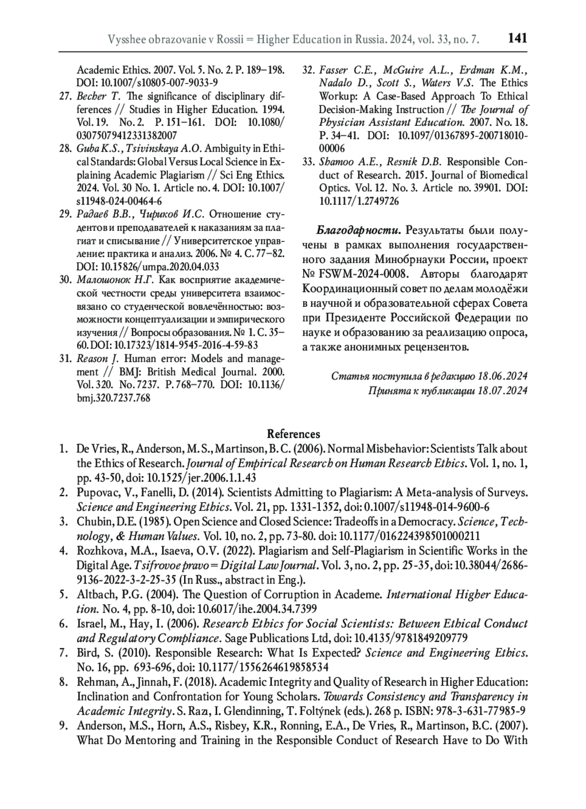 1. De Vries R., Anderson M.S., Martinson B.C. Normal misbehavior: Scientists talk about the ethics of research // Journal of Empirical Research on Human Research Ethics. 2006. Vol. 1. No. 1. P. 43-50. DOI: 10.1525/jer.2006.1.1.43