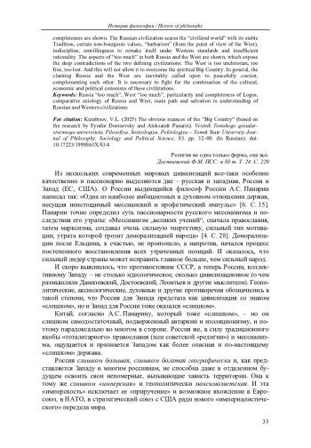 Из нескольких современных мировых цивилизаций все-таки особенно качественно и пассионарно выделяются две – русская и западная, Россия и Запад (ЕС, США). О России выдающийся философ России А. С. Панарин написал так: «Одна из наиболее амбициозных в духовном отношении держав, несущая неистощимый мессианский и профетический импульс» [6. С. 15].