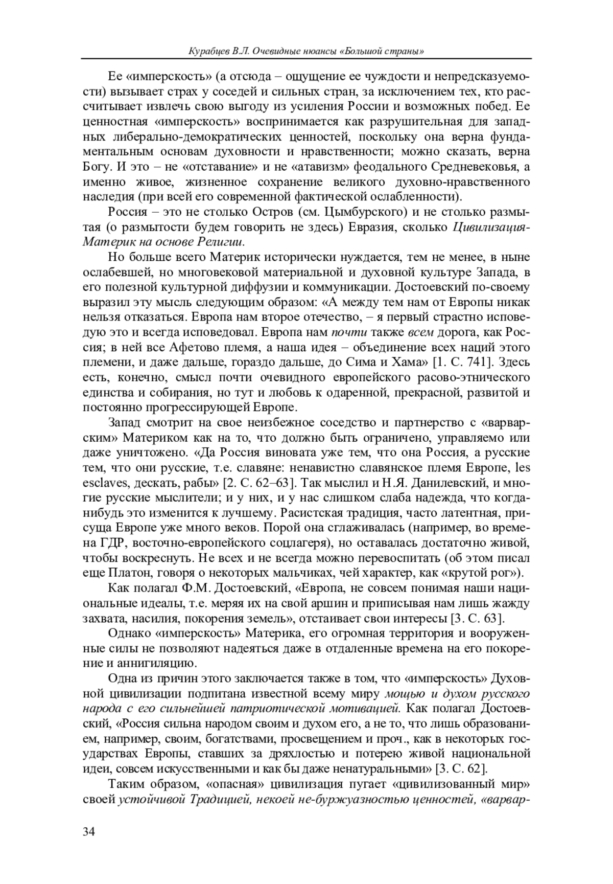 Анализируется специфика и потенциальность «Большой страны», или русской цивилизации. Заявлено новое понимание России - как Цивилизации-Материка на основе Религии. Основное внимание уделено исследованиям по этой теме Ф. М. Достоевского и А. С. Панарина. Показана неизбежность и глубина («слишком») столкновения русской и западной цивилизаций, а также вероятность реализации именно Россией «полноты Логоса» (на основе Традиции и «не-буржуазности»). Автор заявляет об отсутствии конфликта интересов.