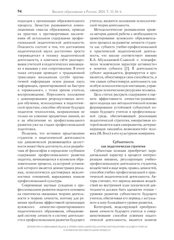 Методологические размышления привели авторов данной работы к необходимости ориентирования вузовского образовательного процесса на развитие личности студента как субъекта учебно-профессиональной и практической педагогической деятельности, что вполне соответствует мнению К. А. Абульхановой-Славской о «специфически человеческом характере активности» в понятии субъекта [2]. В деятельности субъект зарождается, формируется и проявляется, объективируя свои способности, и тем самым субъективируя деятельность как особую психологическую инстанцию, управляющую психическими ресурсами человека.