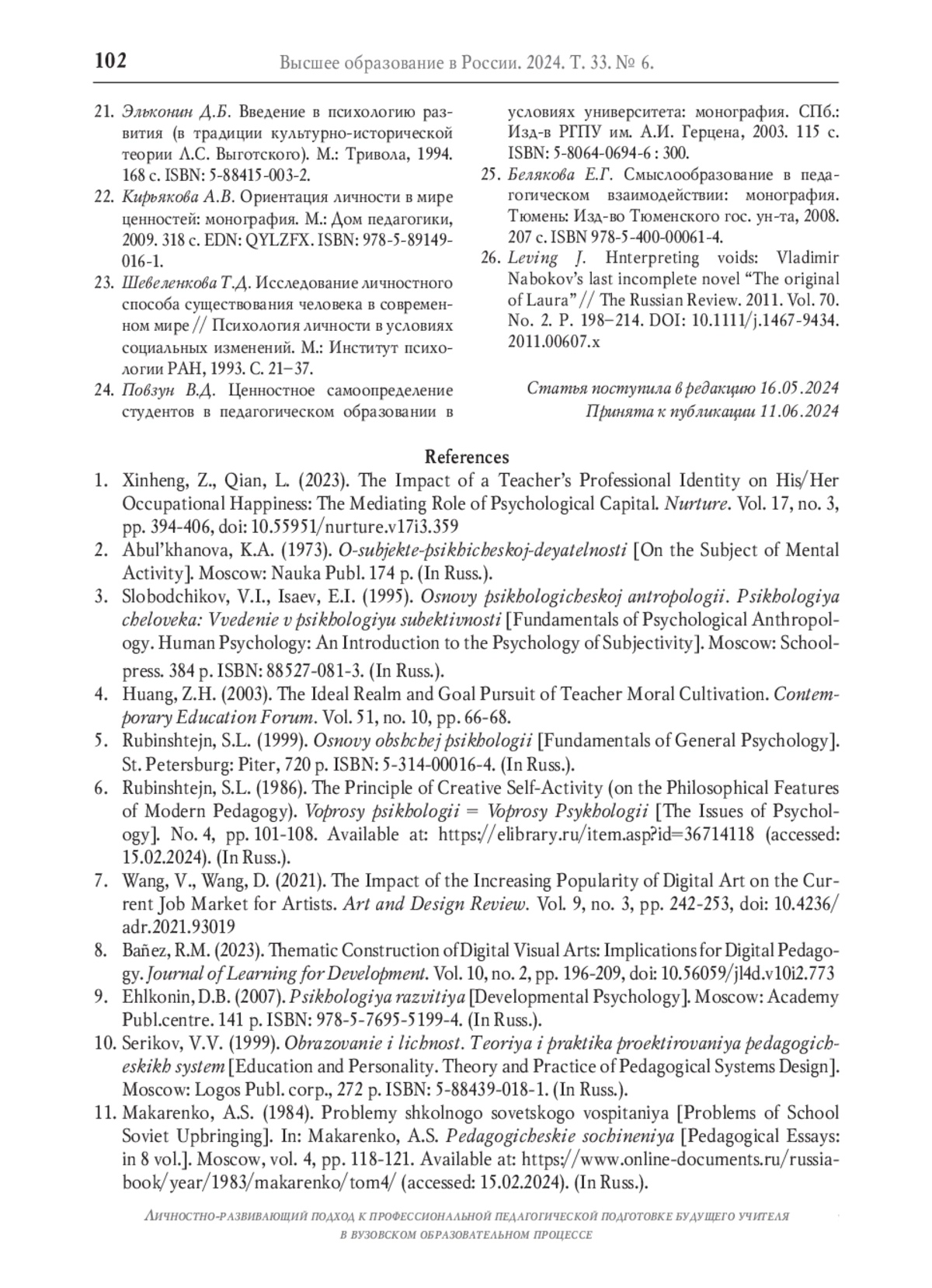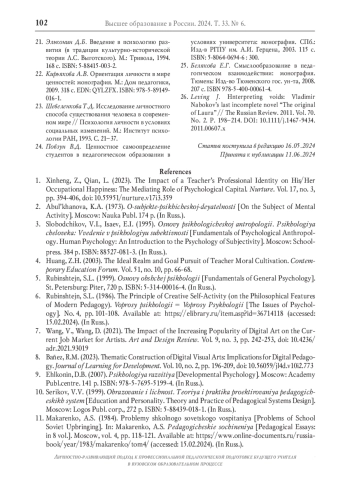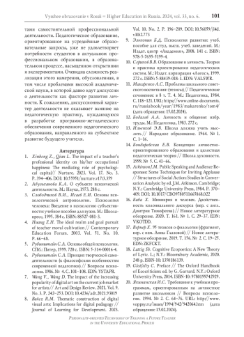 1. Xinheng Z., Qian L. The impact of a teacher’s professional identity on his/her occupational happiness: The mediating role of psychological capital// Nurture. 2023. Vol. 17. No. 3. P. 394-406. DOI: 10.55951/nurture.v17i3.359 EDN: YTNKMS