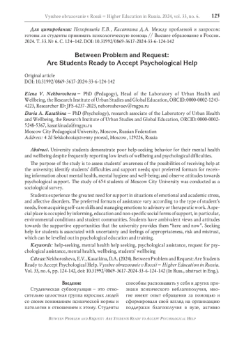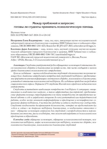 Студенты университетов редко обращаются за помощью в отношении своего психического здоровья и благополучия несмотря на то, что часто сообщают о низком уровне благополучия и психологических затруднениях. Цель исследования - оценка осведомлённости студентов о возможностях получения помощи в вузе; выявление затруднений и потребностей студентов в поддержке; предпочитаемые форматы получения информации о ментальном здоровье, психогигиене и благополучии; установки в отношении психологической поддержки. Исследование проведено посредством социологического опроса. Опрошено 654 студента Московского городского педагогического университета. Студенты испытывают наибольшую потребность в поддержке в ситуациях эмоциональных и академических нагрузок, а также аффективных расстройств; предпочитаемые форматы помощи структурируются по типу потребности от приобретения навыков заботы о себе и управления эмоциями до консультативной или терапевтической работы, особое место занимает информирование и просвещение и неспецифические социальные формы поддержки, в частности средовые условия и студенческие сообщества. Студенты неоднозначно воспринимают возможности, которые им предоставляет вуз «здесь и сейчас» по вопросам поддержки благополучия, и неоднозначно относятся к ним - обращение за помощью сопряжено для студентов с неопределённостью и переживаниями уместности, риска и недоверия, что может нивелироваться в психологическом просвещении и образовании.
