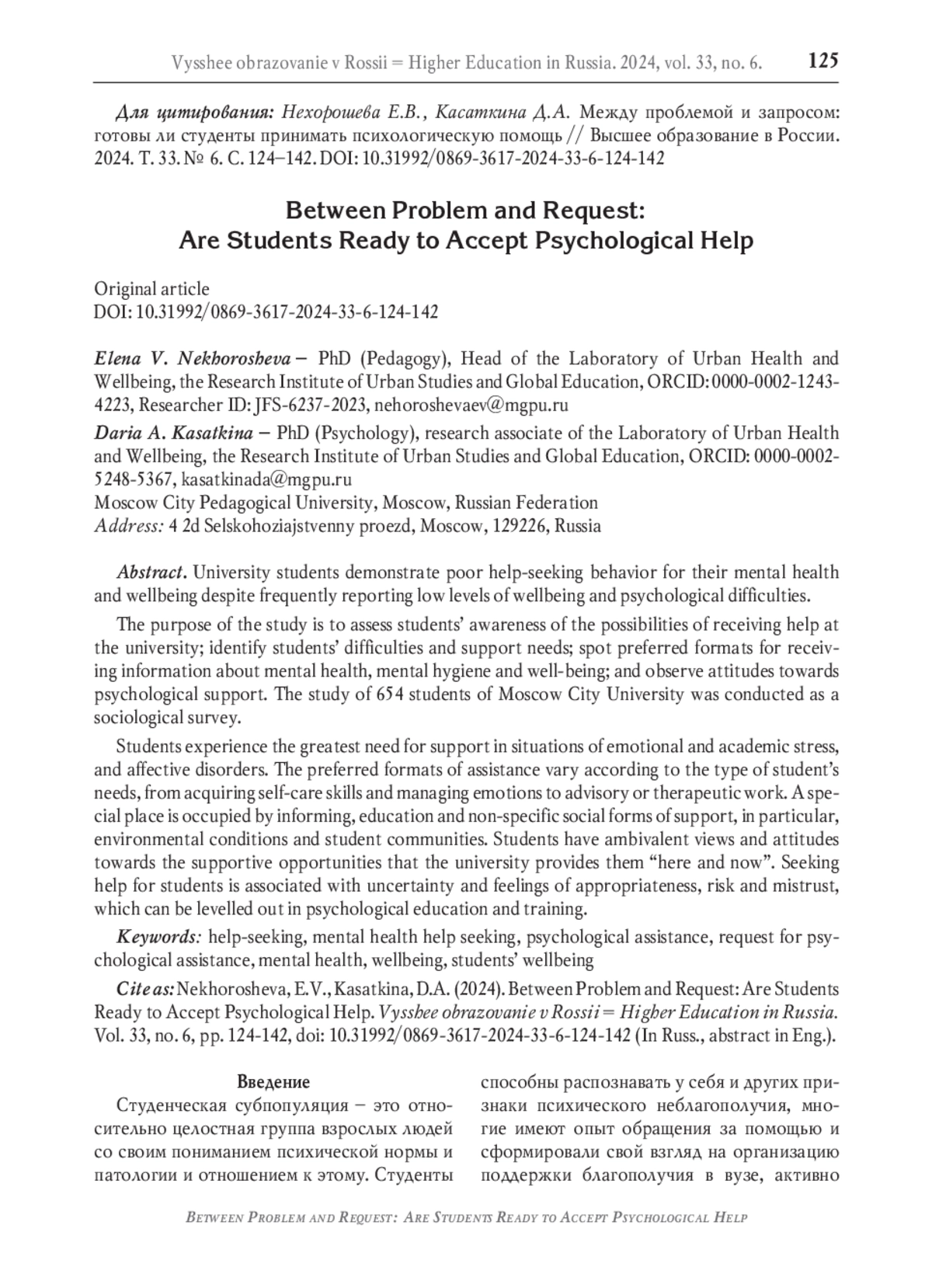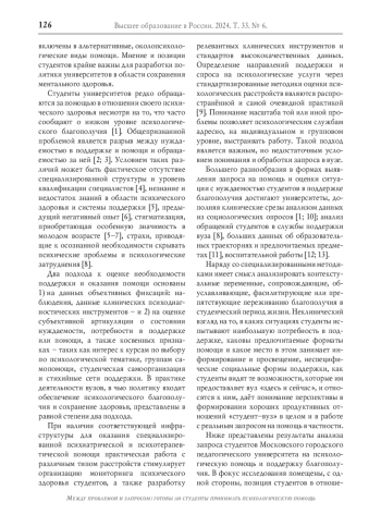 Студенты университетов редко обращаются за помощью в отношении своего психического здоровья несмотря на то, что часто сообщают о низком уровне психологического благополучия [1]. Общепризнанной проблемой является разрыв между нуждаемостью в поддержке и помощи и обращаемостью за ней [2; 3]. Условием таких различий может быть фактическое отсутствие специализированной структуры и уровень квалификации специалистов [4], незнание и недостаток знаний в области психического здоровья и системы поддержки [5], предыдущий негативный опыт [6], стигматизация, приобретающая особенную значимость в молодом возрасте [5–7], страхи, приводящие к осознанной необходимости скрывать психические проблемы и психологические затруднения [8].