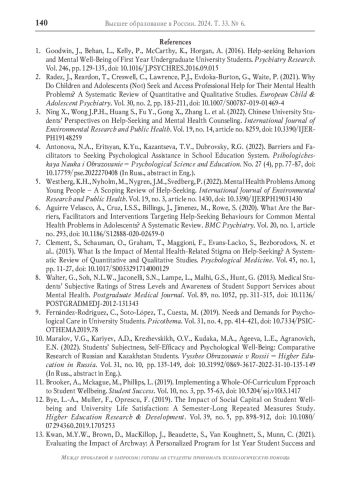 1. Goodwin J., Behan L., Kelly P., McCarthy K., Horgan A. Help-seeking behaviors and mental well-being of first year undergraduate university students // Psychiatry research. Psychiatry Res, 2016. Vol. 246. P. 129-135. DOI: 10.1016/J.PSYCHRES.2016.09.015
