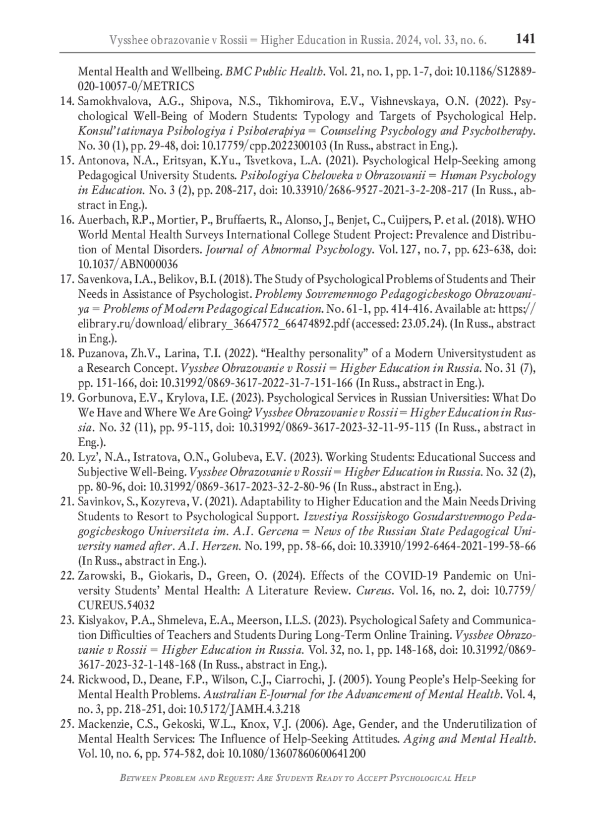 21. Савинков С.Н., Козырева В.В. Адаптированность к обучению в вузе и основные потребности студентов в получении психологической помощи // Известия Российского государственного педагогического университета им. А. И. Герцена. 2021. № 199. C. 58-66. DOI: 10.33910/1992-6464-2021-199-58-66 EDN: ODPNSY