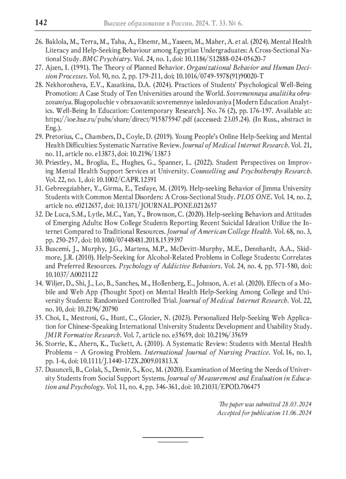 26. Baklola M., Terra M., Taha A., Elnemr M., Yaseen M., Maher A. et al. Mental health literacy and help-seeking behaviour among Egyptian undergraduates: a cross-sectional national study // BMC psychiatry. BMC Psychiatry, 2024. Vol. 24. No. 1. Article no. 202. DOI: 10.1186/S12888-024-05620-7 EDN: PZJDTQ
