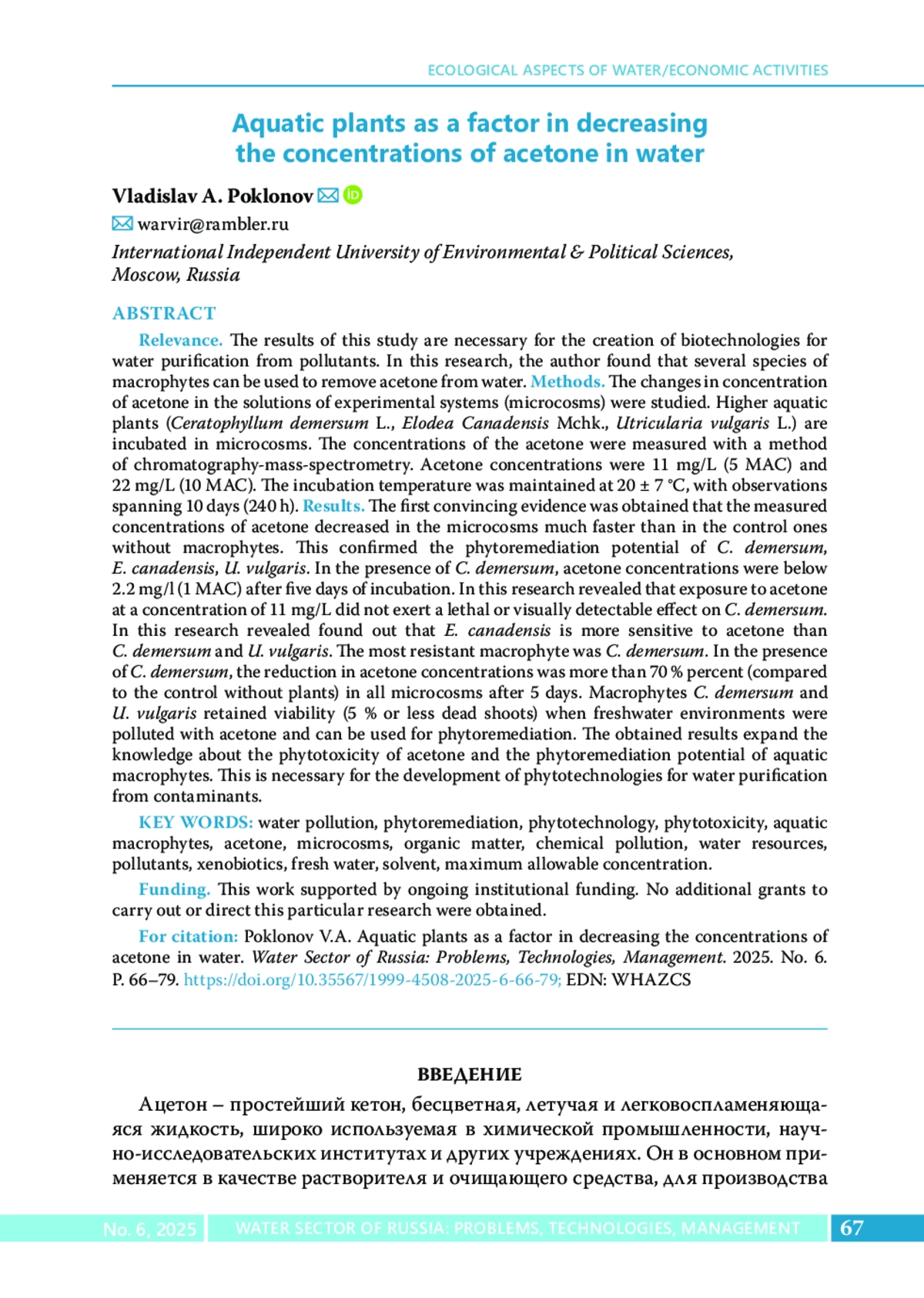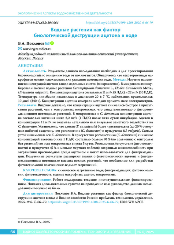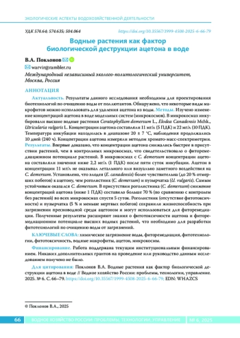 20. Poklonov V.A., Ostroumov S.A., Anikina E.V., Erofeeva V.V. Study of interactions between extreme concentrations of organic solvents and freshwater plants: toxicity and tolerance // Russian Journal of General Chemistry. 2024. Vol. 94. No 13. P. 3661-3671. DOI: 10.1134/S1070363224130309