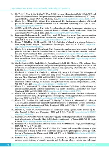 14. Khader E.H., Khudhur R.H., Abbood N.S., Albayati T.M. Decolourisation of anionic azo dye in industrial wastewater using adsorption process: Investigating operating parameters // Environmental Processes. 2023. Vol. 10. P. 34. https://doi.org/1007/s40710-023-00646-7.